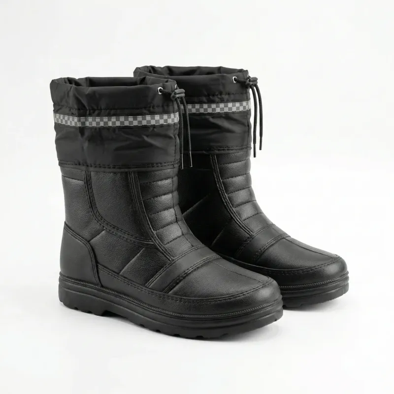 Зустрічайте зиму у всеозброєнні з цими надійними та теплими комбінованими чоботами! Це ідеальне рішення для холодної та мокрої погоди, коли важливо зберегти ноги в теплі та сухості. Модель поєднує в собі найкращі властивості сучасних матеріалів, забезпечуючи максимальний комфорт навіть у найнесприятливіших умовах. Нижня частина чобіт виготовлена з інноваційного матеріалу — піни ЕВА (EVA). Цей матеріал не тільки на 100% водонепроникний, але й надзвичайно легкий та має відмінні теплоізоляційні властивості, не пропускаючи холод від землі. Верхня частина виконана з міцного водовідштовхуючого текстилю з стьобаним візерунком, що додає моделі практичності та стильного вигляду. Всередині чоботи утеплені, що гарантує комфортну температуру для ваших ніг. Особливістю моделі є високий манжет на затяжці зверху. Він надійно фіксується на нозі, запобігаючи потраплянню снігу, вологи та холодного повітря всередину. Для вашої безпеки в темний час доби передбачена спеціальна світловідбиваюча стрічка. Масивна підошва з глибоким протектором забезпечує відмінне зчеплення зі слизькою поверхнею. Ці чоботи стануть вашим незамінним супутником для зимових прогулянок, роботи на вулиці або активного відпочинку. Характеристики: Матеріал низу: Піна ЕВА (EVA) (водонепроникний, легкий) Матеріал верху: Водовідштовхуючий текстиль Колір: Чорний (практичний) Сезон: Зима / Холодна осінь Особливості: Утеплені, манжет на затяжці для захисту від снігу, світловідбиваюча стрічка