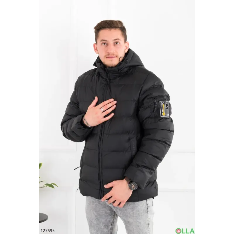 Теги: зимова куртка, чоловіча одежа, чорна куртка, тепла парка, капюшон, штучна вовна, коротка куртка