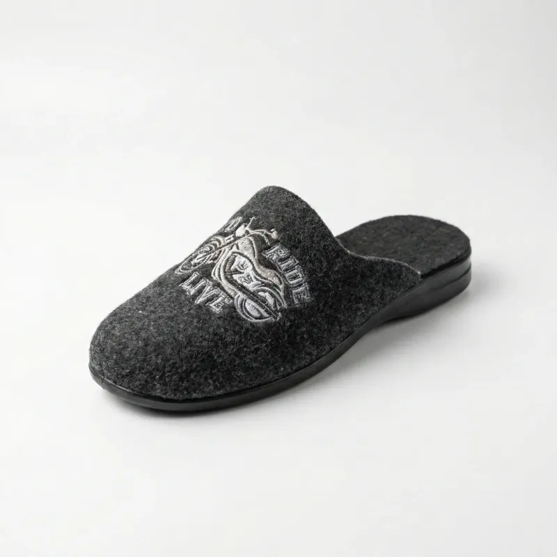 Стильні та зручні чоловічі тапочки для дому, які стануть чудовим подарунком для будь-якого чоловіка, а особливо — для любителів мототехніки. Верх моделі виконаний з якісного щільного повсті (фетру) сірого кольору, який добре пропускає повітря, але при цьому зберігає ноги в теплі. Головна "фішка" цієї моделі — якісна вишивка у вигляді мотоцикла (чопера) та напису "TO RIDE LIVE". Тапочки мають зручну анатомічну форму та відкриту п'яту, що дозволяє легко їх взувати. М'яка устілка та практична чорна підошва забезпечують комфорт при ходьбі по плитці, ламінату чи лінолеуму. Це зносостійке та практичне взуття, яке не потребує складного догляду. Чудовий вибір для дому або як змінне взуття для гостей. Характеристики: Матеріал верху: Повсть / Текстиль Декор: Вишивка "Мотоцикл" Підошва: ПВХ (міцна, не ковзає) Устілка: Текстиль, чорного кольору Колір: Темно-сірий Розміри: 41, 42, 43, 44, 45