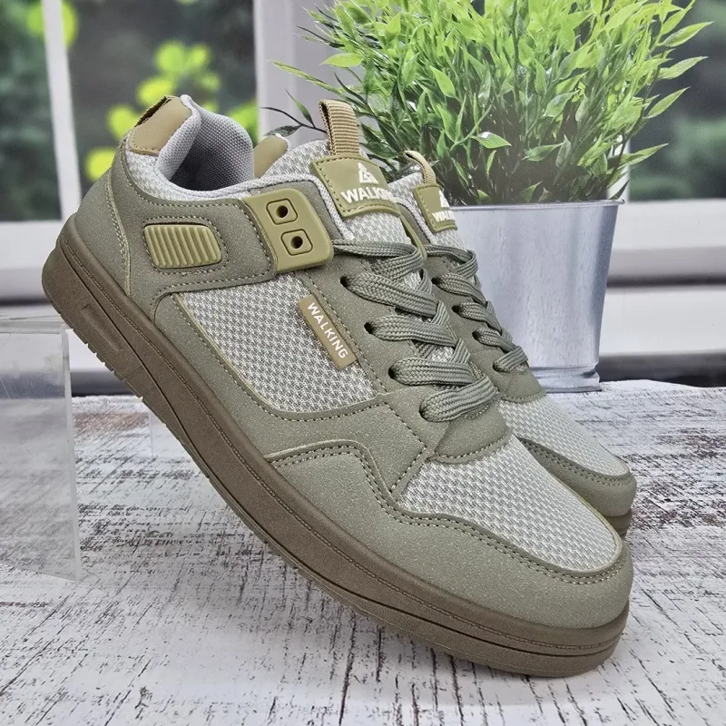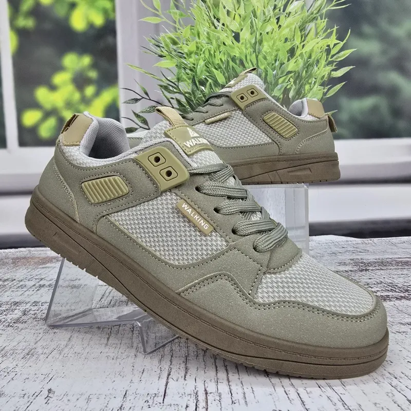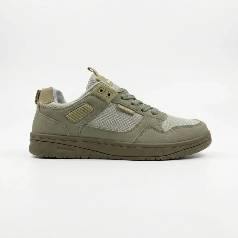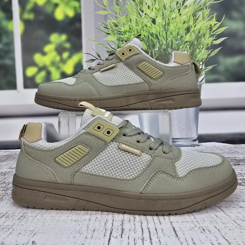 Шукаєте ідеальне взуття для довгих прогулянок містом? Чоловічі кросівки з серії "Walking" у трендовому оливковому кольорі (хакі) створені саме для цього. Дизайн моделі стриманий та стильний: верх та підошва виконані в одному тоні, що виглядає дуже сучасно та дорого. Комбінований верх поєднує міцні накладки з еко-нубуку та вставки з великої дихаючої сітки, яка забезпечує чудову циркуляцію повітря у теплу погоду. Пластикові елементи шнурівки та посилена п'ята додають конструкції надійності. Підошва гнучка, зносостійка та комфортна для стопи. Це універсальна пара, яка пасуватиме і до джинсів, і до шортів. Характеристики: Матеріал верху: Еко-нубук + Текстильна сітка Матеріал підошви: ПВХ (в тон верху) Колір: Оливковий / Хакі (Бежево-зелений) Декор: Напис "WALKING", пластикові люверси Застібка: Шнурівка Сезон: Літо / Тепла весна-осінь Розмірна сітка: 41-45