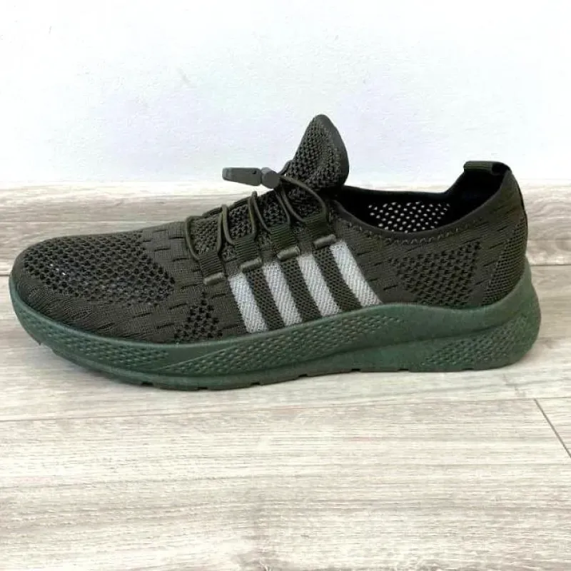 Легкі та дихаючі чоловічі кросівки у практичному кольорі хакі (олива). Ця модель створена для максимального комфорту у літню спеку. Верх виготовлено з якісного текстилю (сітки) за технологією наскрізного плетіння, що забезпечує відмінну вентиляцію стопи. Головна перевага цієї пари — система швидкої шнурівки (затяжка з фіксатором). Завдяки еластичному шнурку та карабіну взуття легко одягається, знімається та ідеально фіксується на нозі без необхідності зав'язувати вузли. Гнучка підошва добре амортизує кроки, знижуючи втому ніг протягом дня. Стильний дизайн з білими смужками додає взуттю спортивного характеру. Це універсальний вибір для міста, природи або як змінне взуття для відпочинку військових. Характеристики: Тип взуття: Кросівки текстильні / Сліпони Матеріал верху: Дихаюча сітка (Flyknit) Матеріал підошви: ПВХ/Піна (еластична) Застібка: Еластична шнурівка з фіксатором Колір: Хакі (Олива/Темно-зелений) Сезон: Літо Розміри: 41-45