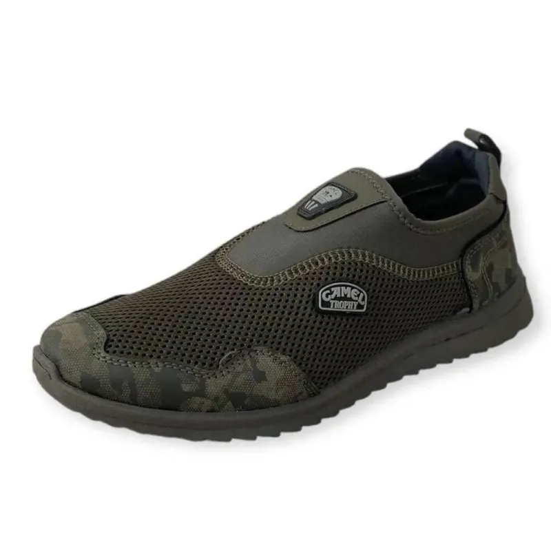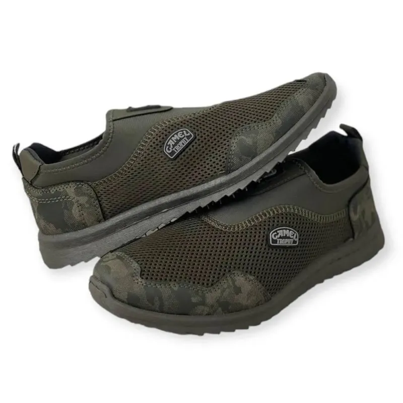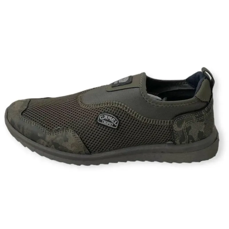 Максимальний комфорт у спеку забезпечать ці чоловічі літні сліпони. Модель виконана з міцної наскрізної сітки, яка гарантує ідеальну вентиляцію стопи. Стильний дизайн у кольорі хакі з камуфляжними вставками на носку та п'яті робить це взуття відмінним вибором для шанувальників стилю мілітарі. Головна перевага цієї моделі — відсутність шнурків. Еластичні гумові вставки дозволяють швидко взуватися та надійно фіксують мокасини на нозі (підходять на будь-який підйом). Посилені носок та задник захищають сітку від протирання та подовжують термін служби взуття. Легка та гнучка підошва не втомлює ноги навіть при тривалій ходьбі. Це універсальне взуття підійде як змінка для військових, так і для повсякденного носіння, водіння авто, поїздок на дачу чи риболовлю. Характеристики: Тип взуття: Сліпони / Мокасини / Літні туфлі Матеріал верху: Текстильна сітка (дихаюча) Матеріал підошви: ПВХ (гнучка) Колір: Хакі (Темно-зелений) + Камуфляж Сезон: Літо Особливості: Без шнурків, логотип Camel Trophy Розміри: 41-45