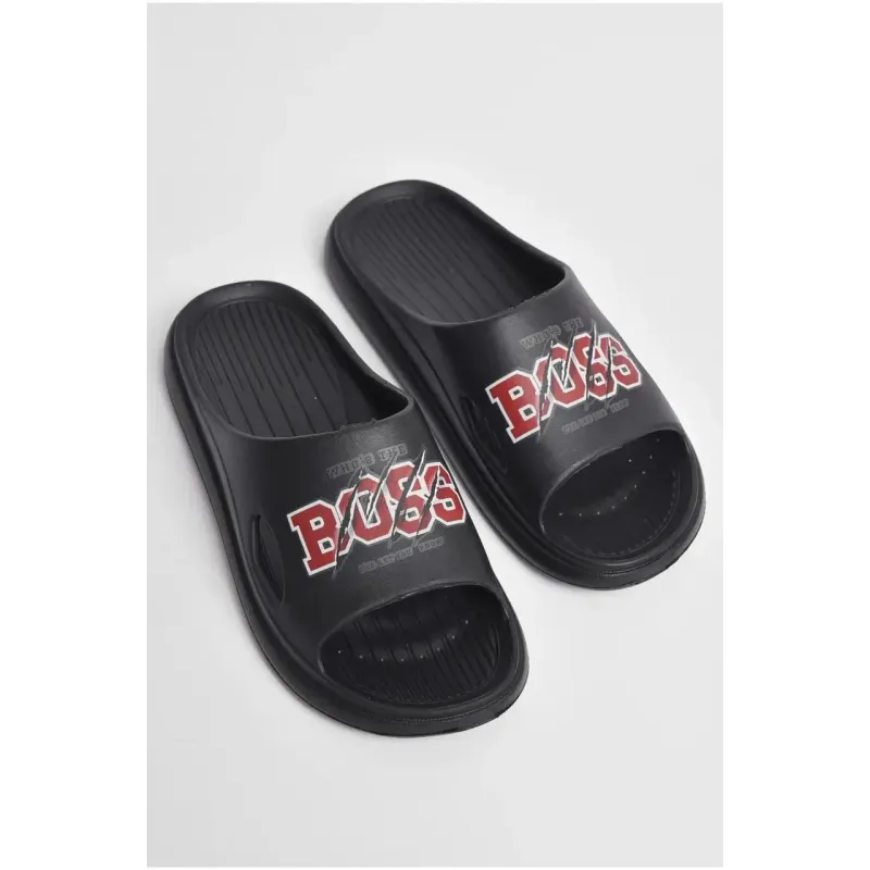 Теги: чоловічі шльопанці, пляжний одяг, гумові шльопанці, чорний колір, принт BOSS, чоловічий стиль, літній одяг