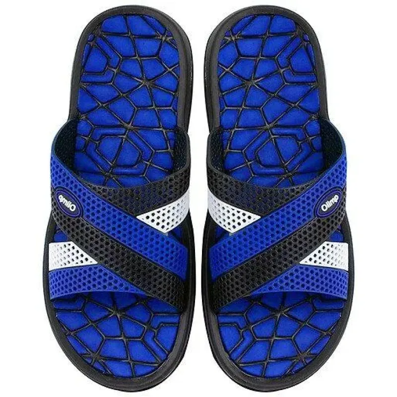 Ці чоловічі шльопанці Olimp вирізняються стильним спортивним дизайном та продуманою ергономікою. Модель виконана в ефектному поєднанні синього та чорного кольорів з білими вставками. Верх складається з двох перехресних широких ремінців, що забезпечує надійну фіксацію стопи та комфорт при ходьбі. Ремінці мають перфоровану структуру (сіточку) для відмінної вентиляції. Збоку розташований помітний логотип "Olimp". Особливої уваги заслуговує устілка з унікальним геометричним візерунком (нагадує павутиння або мозаїку), який не лише стильно виглядає, а й запобігає ковзанню мокрої ноги всередині взуття. Характеристики: Бренд/Модель: Olimp. Тип: Шльопанці (Cross slides). Конструкція: Перехресні ремінці. Колір: Синій з чорним та білим (Blue/Black). Матеріал: ПВХ / Гума. Розмірний ряд: 41, 42, 43, 44, 45.