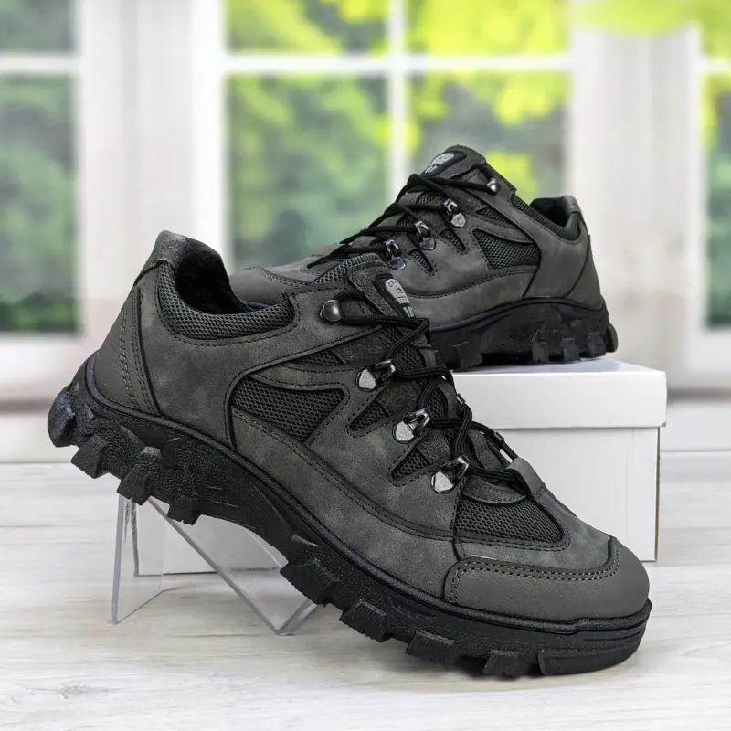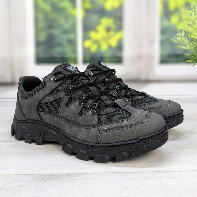 Потужні та стильні чоловічі кросівки для активного повсякденного носіння та легкого туризму. Дизайн моделі виконаний у популярному стилі Camel Trophy, що підкреслює надійність та чоловічий характер взуття. Верх виготовлений з якісного еко-нубука темно-сірого кольору, скомбінованого з міцними текстильними вставками (сіткою), що забезпечує ногам відмінну вентиляцію. Підошва в цій моделі — справжній "всюдихід". Вона масивна, з глибоким агресивним протектором, що гарантує ідеальне зчеплення з будь-якою поверхнею: асфальтом, піском чи мокрою травою. Посилений носок та п'ятка захищають ногу від ударів, а міцна шнурівка на металевих петлях дозволяє надійно зафіксувати взуття. Це ідеальний вибір на весну та осінь для тих, хто шукає зносостійке взуття, яке не боїться активного навантаження. Характеристики: Матеріал верху: Еко-нубук + Текстиль (сітка). Сезон: Весна / Осінь (Демісезон). Підошва: ПВХ з глибоким протектором (антиковзка). Стиль: Трекінговий / Повсякденний / Мілітарі. Колір: Темно-сірий (Графіт). Розмірний ряд: 41-45. Застібка: Шнурівка.