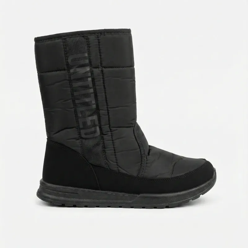 Зустрічайте зиму в комфорті з новими чоловічими дутиками серії "Untitled". Ця модель розроблена для тих, хто шукає практичне взуття на кожен день. Верх виконаний з міцної водовідштовхувальної плащової тканини (текстилю), яка не тріскається на морозі та легко чиститься від бруду. Головна перевага моделі — зручність взування завдяки надійній бічній блискавці. Вам не потрібно возитися зі шнурками. Стильний вертикальний напис "Untitled" додає взуттю сучасного вигляду. Всередині чоботи утеплені густим штучним хутром, що зберігає тепло. Висока підошва захищає від промерзання знизу та має протектор проти ковзання. Характеристики: Тип взуття: Зимові чоботи / Дутики Матеріал верху: Водовідштовхувальний текстиль (плащівка) Утеплювач: Штучне хутро Застібка: Блискавка Підошва: ПВХ (зносостійка) Колір: Чорний Особливості: Декор з написом "Untitled" Сезон: Зима Розміри в наявності: 41-45