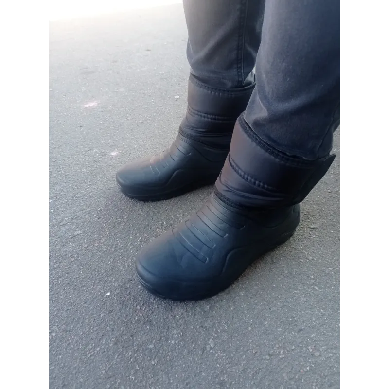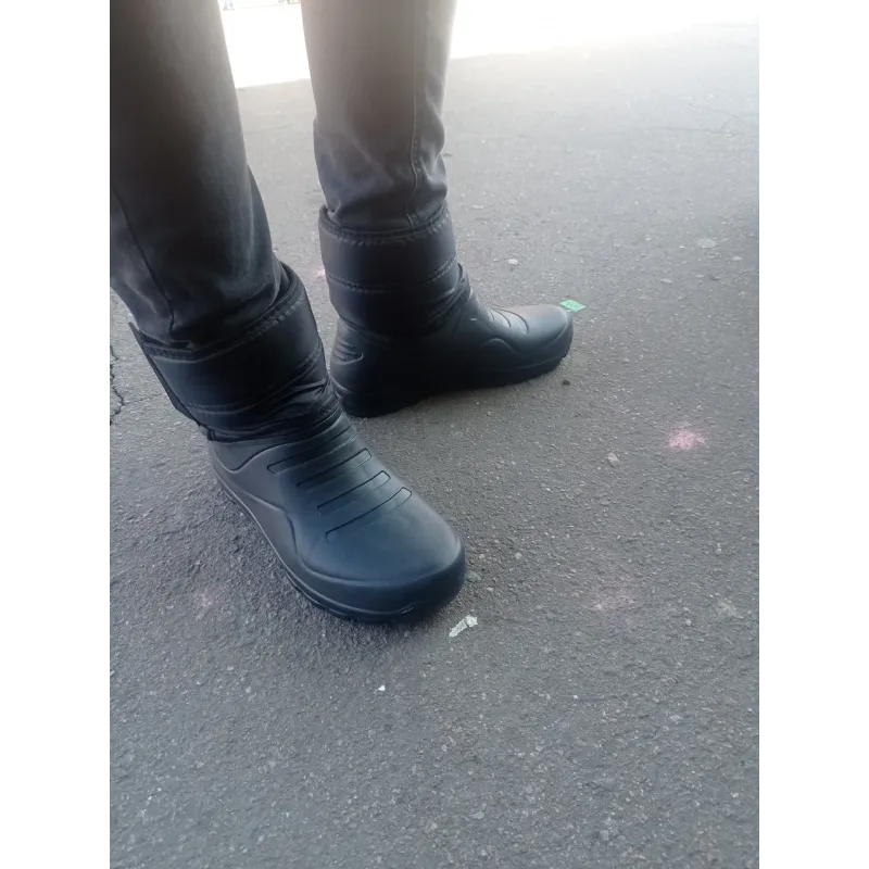 Надійні та теплі чоловічі чоботи (дутики), розроблені спеціально для активного використання в складних погодних умовах. Ця модель — "гібрид", що поєднує в собі переваги гумових чобіт та теплого зимового взуття. Нижня частина (калоша) виготовлена з суцільнолитої піни ЕВА, яка на 100% захищає від води, сльоти та бруду, а також відмінно ізолює від холоду землі. Верхня частина виконана з міцного водовідштовхувального текстилю, утепленого зсередини густим хутром. Головна особливість моделі — широка застібка на липучці, яка дозволяє щільно зафіксувати чобіт на нозі, запобігаючи потраплянню снігу та холодного повітря всередину. Підошва має глибокий протектор, що забезпечує надійне зчеплення зі слизькою поверхнею. Це ідеальний вибір для зимової риболовлі, полювання, роботи в приватному секторі або прогулянок по глибокому снігу. Характеристики: Матеріал низу: Піна ЕВА (легка, водонепроникна). Матеріал верху: Водовідштовхувальна тканина (плащівка). Утеплювач: Штучне хутро по всій внутрішній поверхні. Застібка: Липучка (регулювання об'єму). Колір: Чорний. Сезон: Зима. Розмірний ряд: 41-46 (Чоловічі). Виробник: Україна.