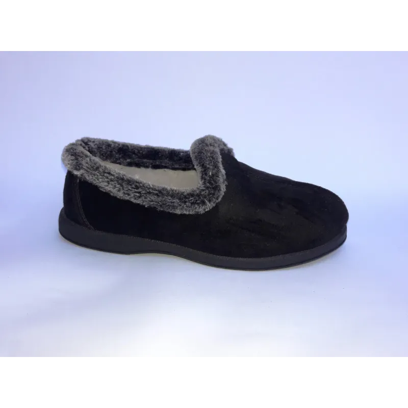Стильні та дуже теплі домашні чуні (капці) чорного кольору — ідеальний вибір для тих, хто любить класику та комфорт. Ця модель поєднує в собі елегантний вигляд та практичність. Верх виконаний з м'якого текстилю з фактурою під замшу (велюр), який приємний на дотик і виглядає охайно. Краї капців оздоблені густою хутряною облямівкою (опушкою), яка не тільки прикрашає взуття, а й додатково зігріває ногу в зоні щиколотки. Всередині чуні утеплені, що робить їх незамінними в холодну пору року. Завдяки формі сліпонів (без застібок) та широкому входу, їх можна взути миттєво, не докладаючи зусиль. Підошва виготовлена з ПВХ — вона легка, не ковзає на лінолеумі чи плитці та надійно захищає стопу від холоду з підлоги. Чорний колір робить модель максимально практичною та немаркою. Характеристики: Сезон: Зима / Осінь Матеріал верху: Текстиль (фактура під замшу/велюр) Матеріал підкладки: Штучне хутро Особливості: Хутряна опушка, легка вага, без застібок Колір: Чорний Підошва: ПВХ (лита) Розміри в наявності: 37, 38, 39, 40, 41, 42