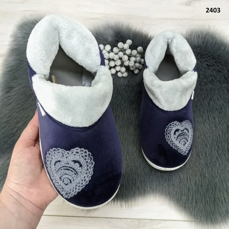 Неймовірно ніжні та теплі домашні чуні (капці) від популярного українського бренду Dagohome. Ця модель створена, щоб дарувати тепло та гарний настрій. Глибокий темно-синій колір верху стильно контрастує зі світлою підошвою та хутром, а головною прикрасою є велика ажурна вишивка у формі серця на носочку. Верх виготовлений з м'якого та приємного на дотик велюру. Всередині чуні утеплені густим світлим хутром, яке забезпечує комфорт навіть у найхолодніші дні. Верхній край має широкий хутряний відворот, що додає моделі затишку. Підошва білого кольору, прошита, виготовлена з еластичного матеріалу, стійка до зносу та не ковзає по плитці чи паркету. Завдяки зручній колодці ноги в такому взутті відпочивають після важкого дня. Характеристики: Сезон: Зима / Осінь / Весна Виробник: Dago Style (Україна) Матеріал верху: Текстиль (велюр) Матеріал підкладки: Тепле еко-хутро (світле) Декор: Вишивка «Ажурне серце», бірка бренду Колір: Темно-синій (Indigo) Підошва: ПВХ (прошита) Розміри в наявності: 37, 38, 39, 40, 41