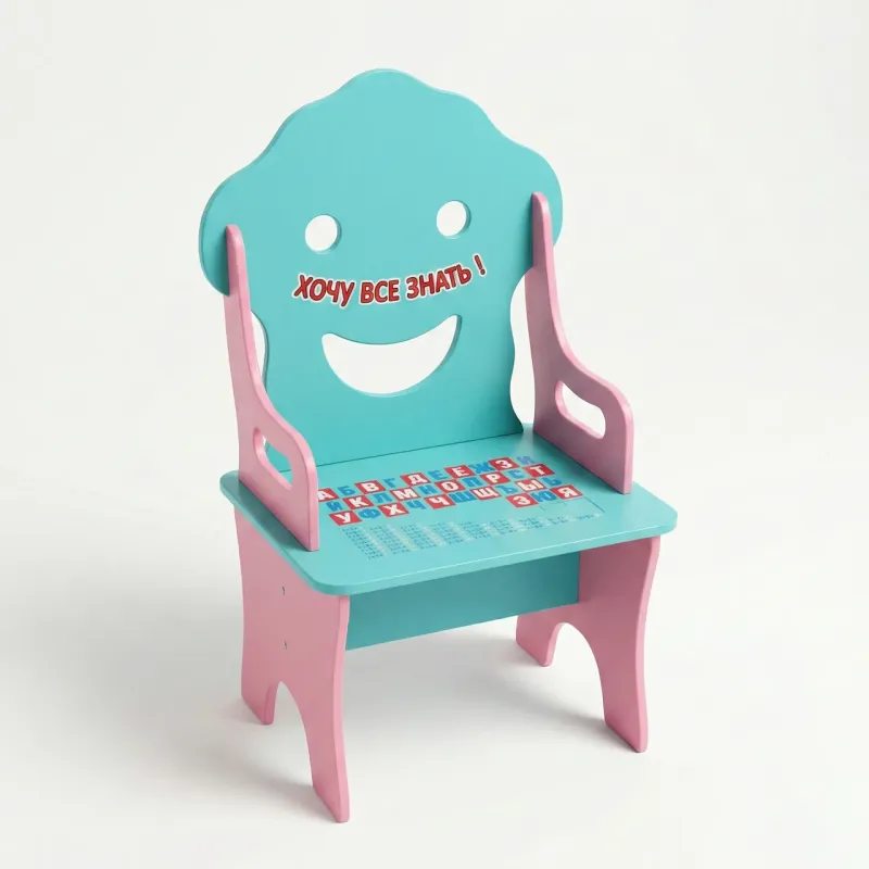 Перетворіть навчання на гру з яскравим дитячим стільчиком "Хочу все знати"! Ця модель розроблена спеціально для допитливих малюків, які готуються до школи або вже почали гризти граніт науки. Оригінальний дизайн спинки у вигляді усміхненого смайлика обов'язково підніме настрій вашій дитині. Головна особливість стільчика — навчальне сидіння: Абетка: На поверхні нанесені великі яскраві літери, що допоможе дитині швидко та невимушено вивчити алфавіт. Математика: З боків розташована таблиця множення, яка завжди буде перед очима, що сприяє кращому запам'ятовуванню. Стільчик виготовлений з якісних матеріалів (МДФ/Дерево), пофарбований безпечними фарбами у приємні бірюзові та рожеві кольори. Конструкція стійка та надійна, всі кути заокруглені для безпеки малюка. Ідеально підходить для малювання, ліплення, навчання або обіду. Характеристики: Тип: Дитячий стільчик зі спинкою Матеріал: Дерево / МДФ (фарбований) Декор: Напис "Хочу все знати!", принт Абетка та Таблиця множення Колір: Бірюзовий (основа) + Рожевий (ніжки) Призначення: Для навчання та ігор Стать: Для дівчинки / Унісекс