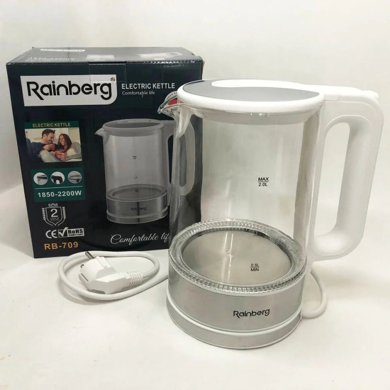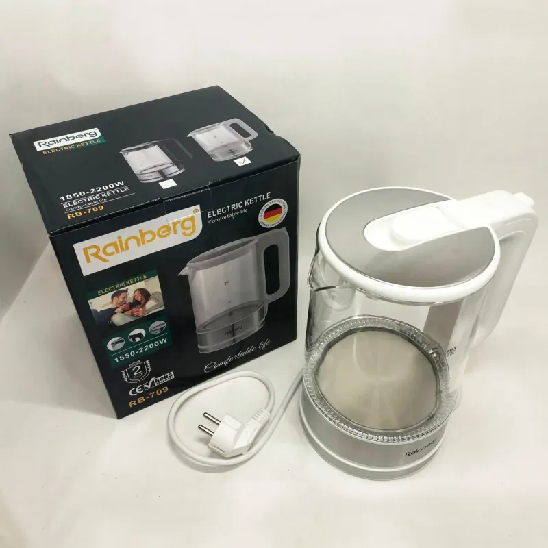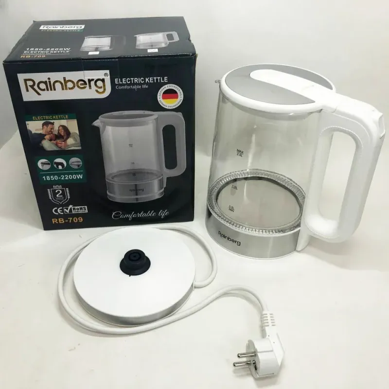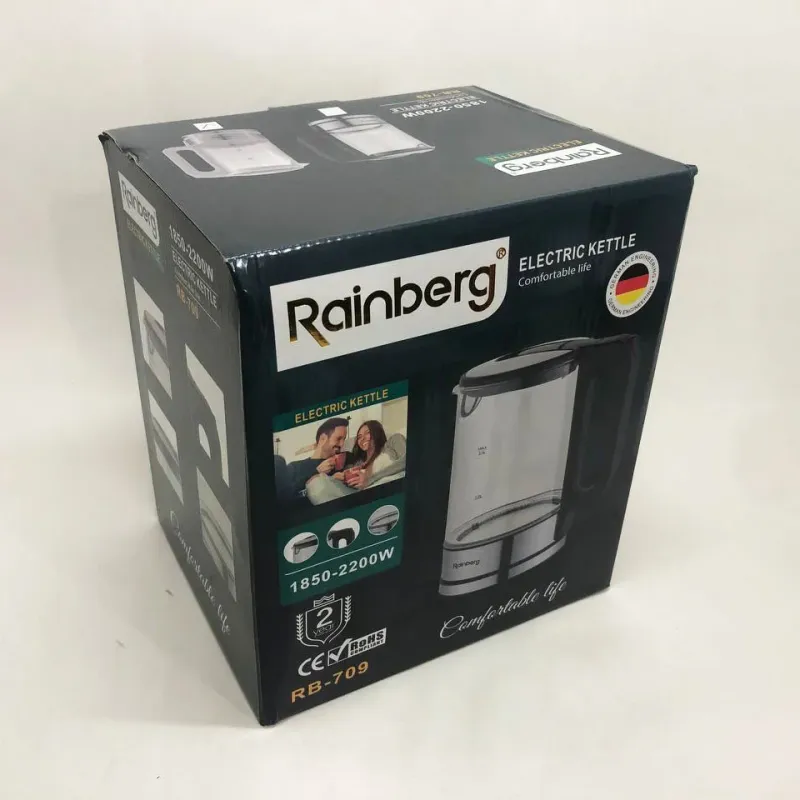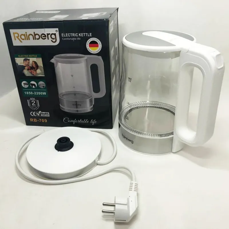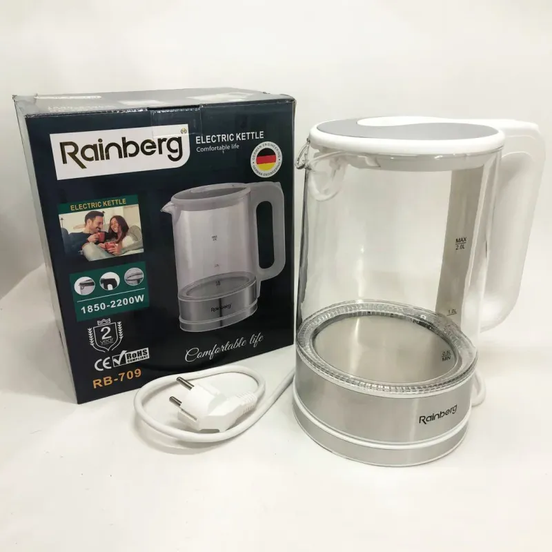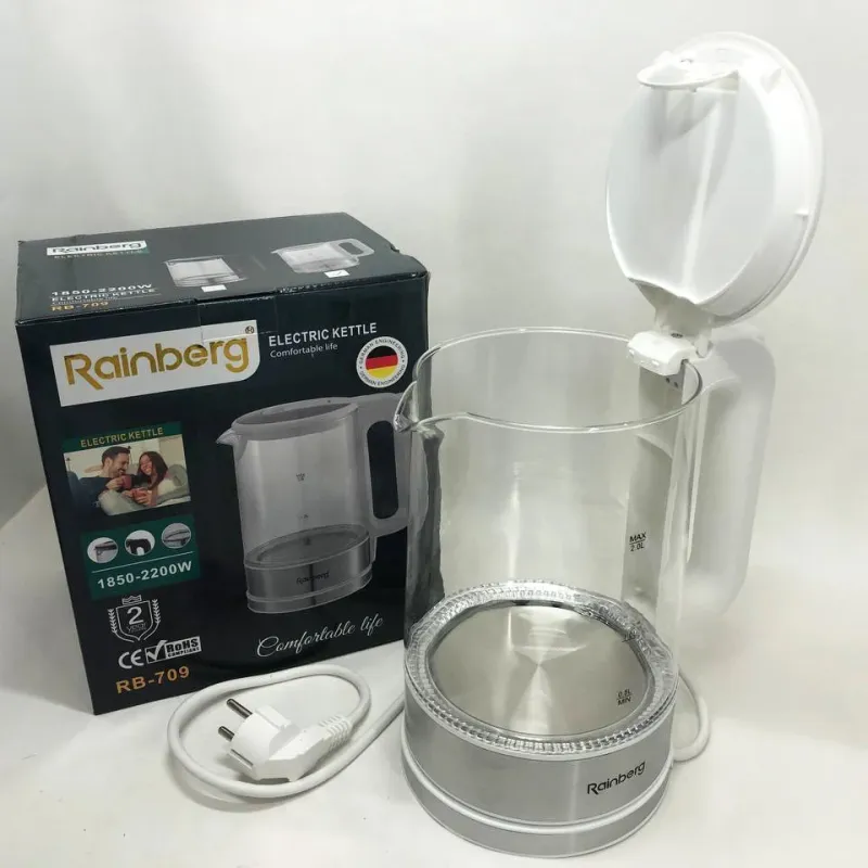 Rainberg RB-709 ідеально підходить для швидкого приготування гарячих напоїв у будь-який час доби. Його потужність 2200 Вт дозволяє за лічені хвилини отримати воду необхідної температури. Завдяки поворотній платформі чайник зручно використовувати в умовах обмеженого простору, а функція автоотключення запобігає випадковим пошкодженням при відсутності води. Прилад буде незамінним в офісі для швидких перерв, вдома для приготування кави чи чаю, а також у подорожах або на дачі при наявності електроживлення 220-240 В.