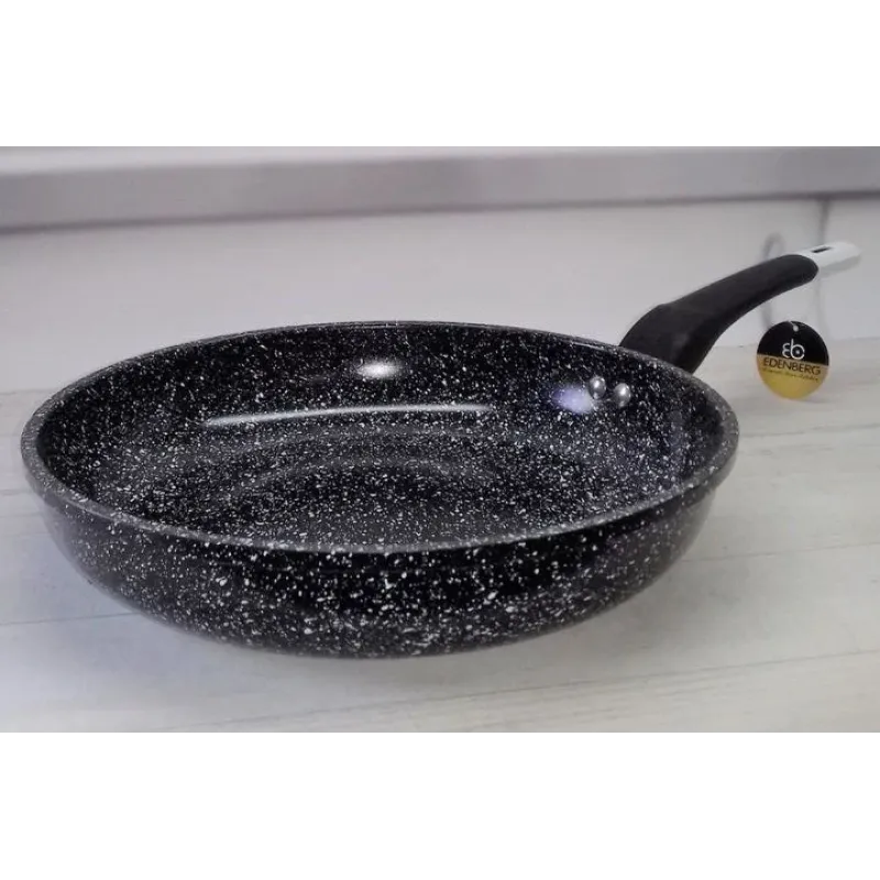 EB-4126 Сковорода 28 см. Темне Гранітне Покриття — рівномірний нагрів та антипригарне покриття для здорового приготування їжі. Антипригарне мармурове або гранітне покриття не потребує великої кількості олії та легко чиститься. Товсте дно рівномірно розподіляє тепло по всій поверхні. Зручна бакелітова ручка не нагрівається. Підходить для газових, електричних та індукційних плит.
