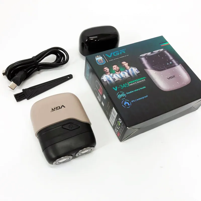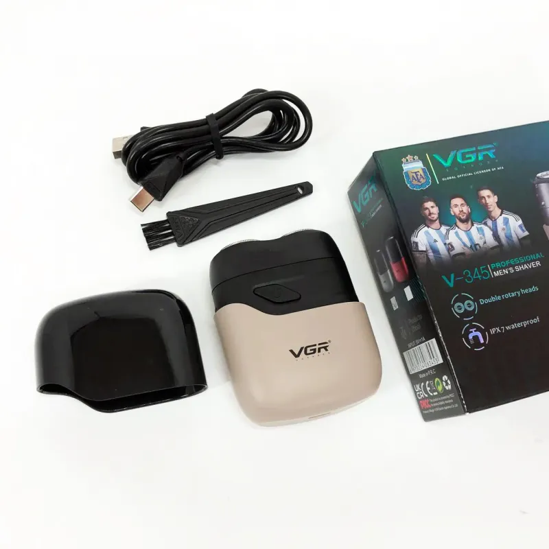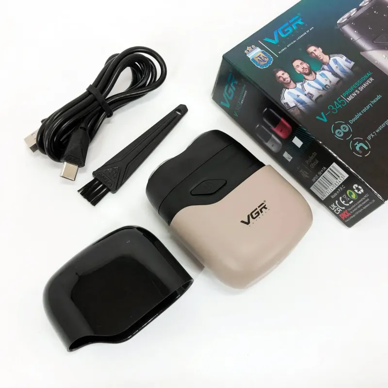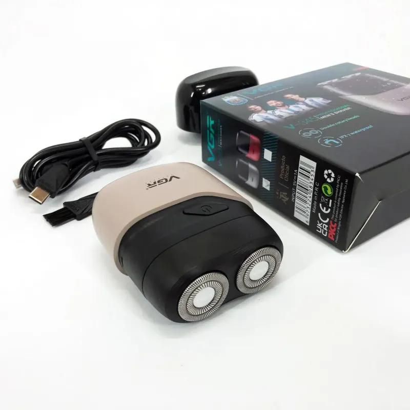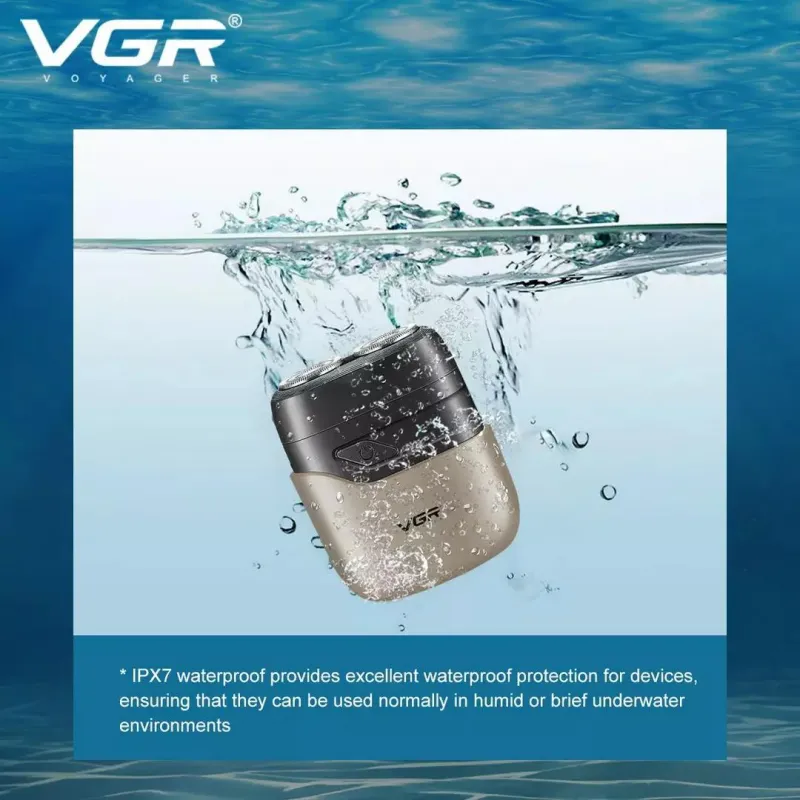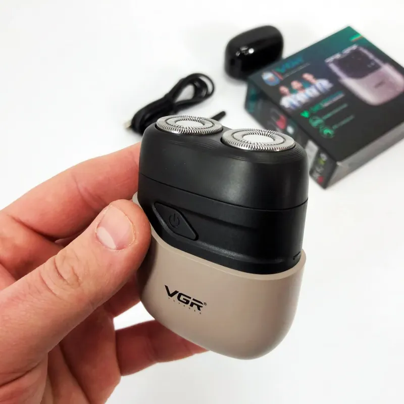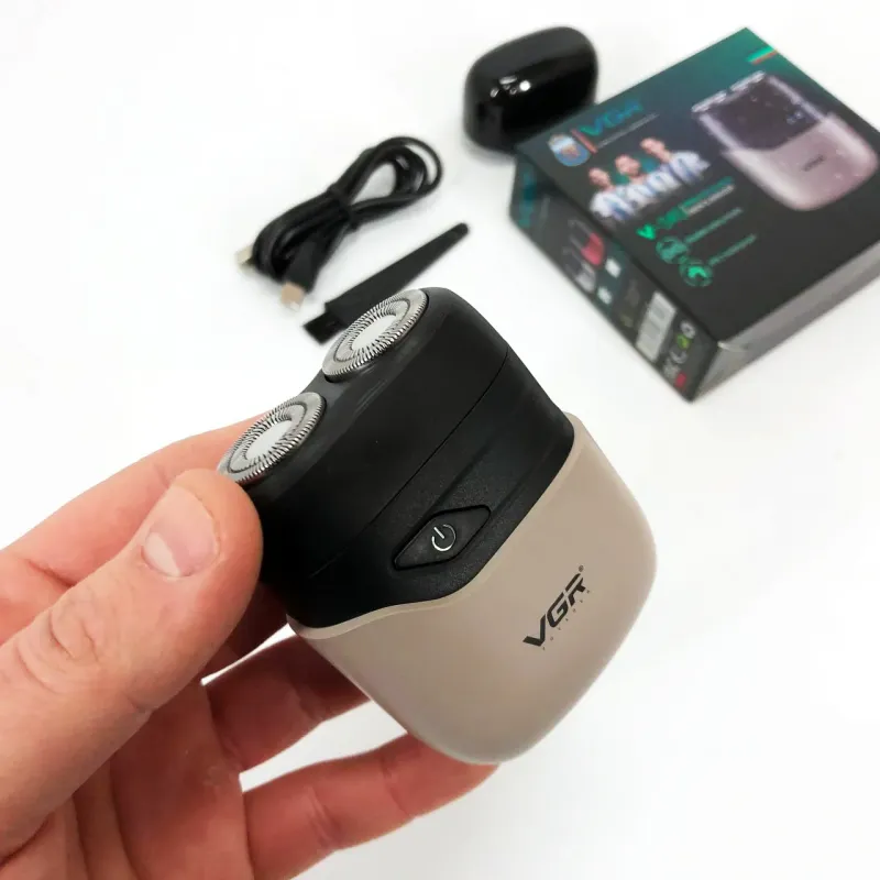 Бритва VGR обладает водонепроницаемостью по стандарту IPX7, что позволяет использовать ее во влажных условиях или быстро чистить под водой. Имеет индикатор зарядки через USB и встроенный светодиодный дисплей для легкой зарядки и мониторинга состояния.