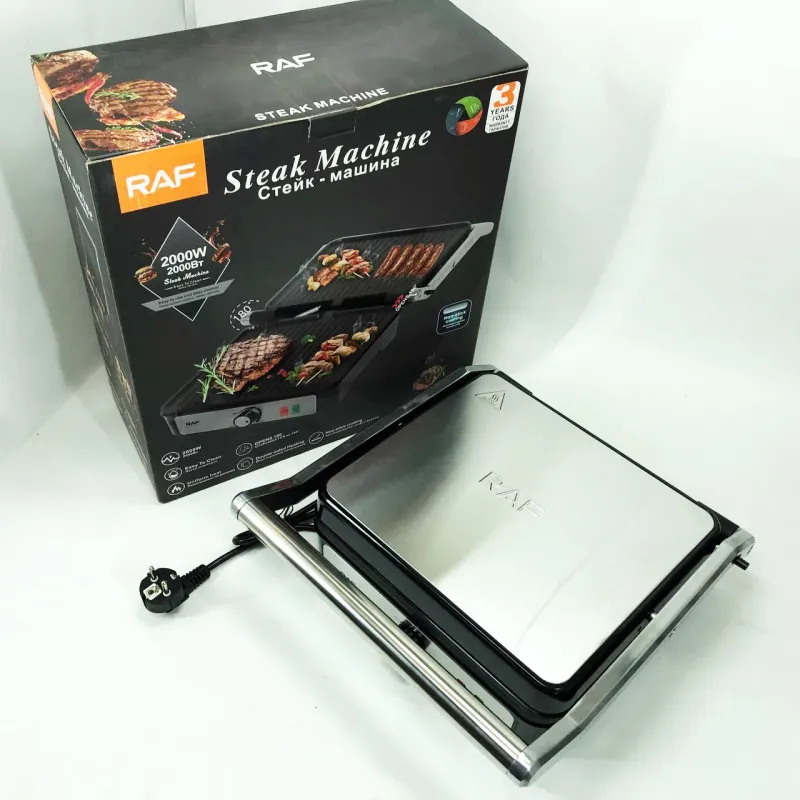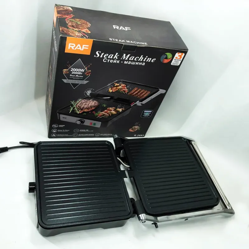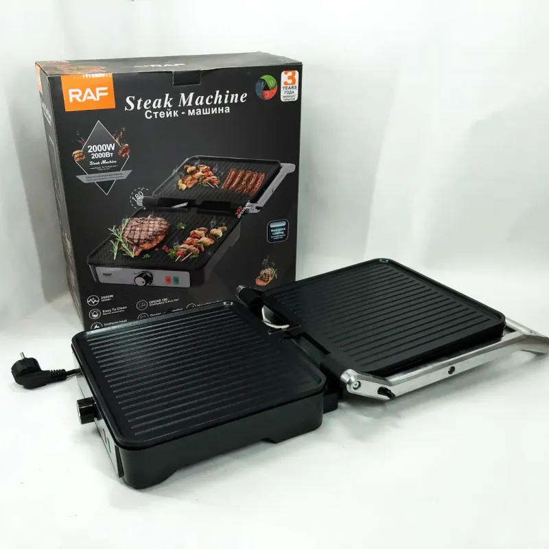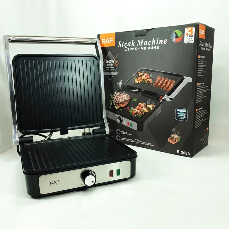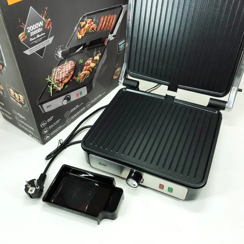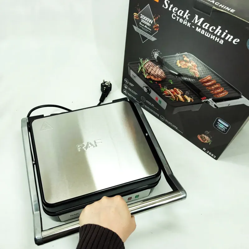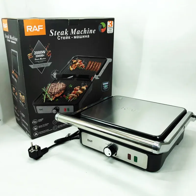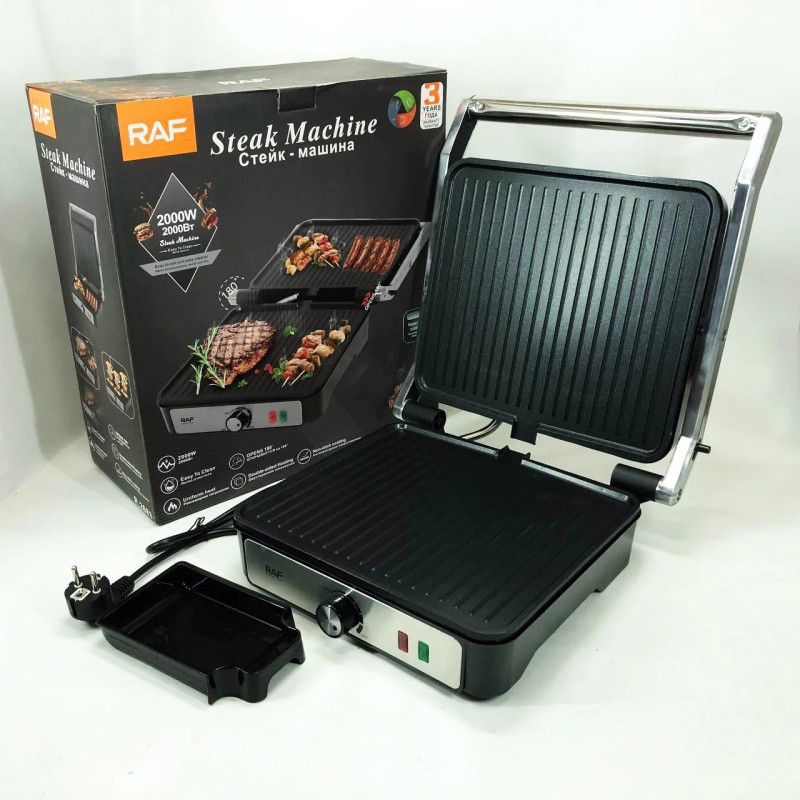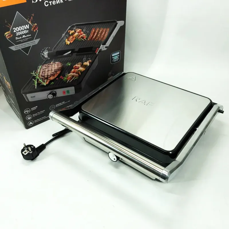 Контактный гриль прижимной электрический с терморегулятором и антипригарным покрытием RAF R-2683  - Хотите в любое время насладиться сочным стейком, хрустящими овощами или панини? Вам больше не нужно иметь кухню, полную бытовой техники. Все, что вам нужно, - это электрический гриль RAF.