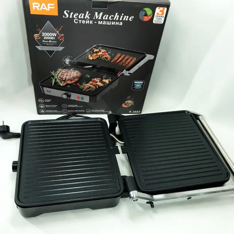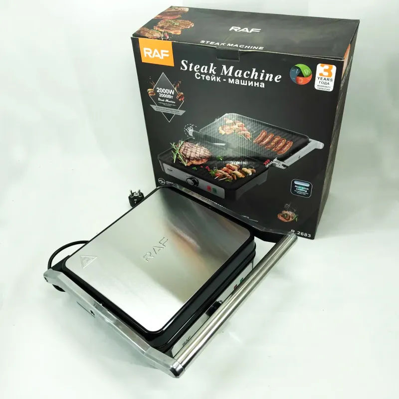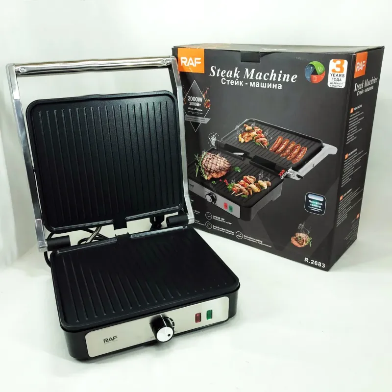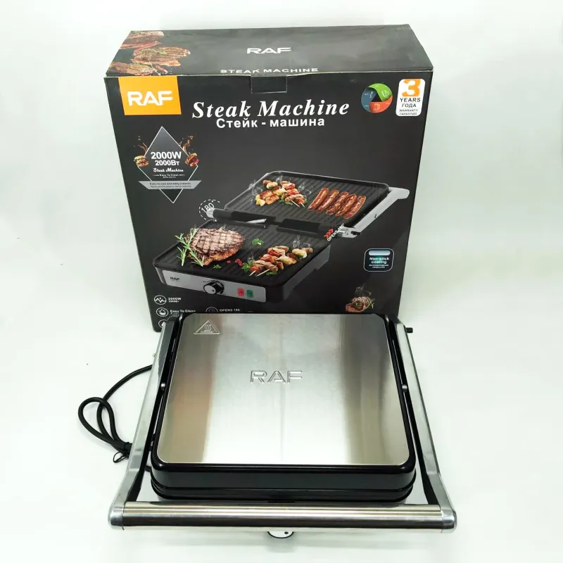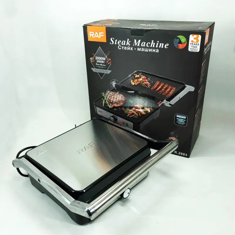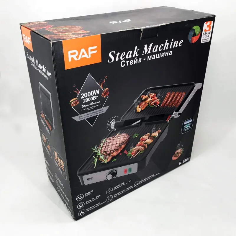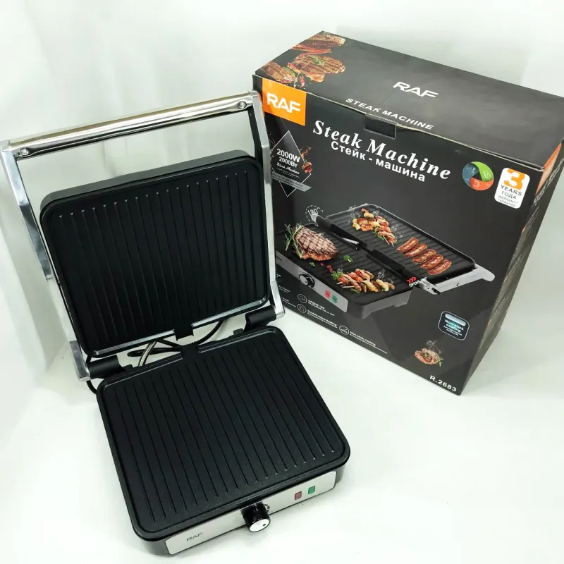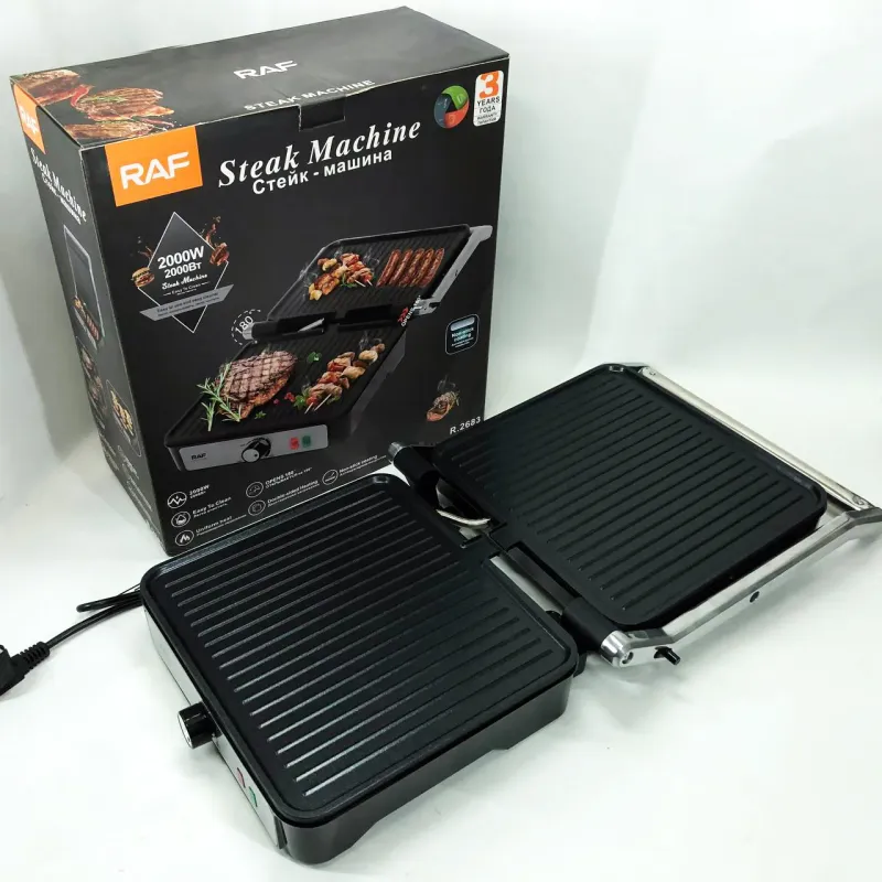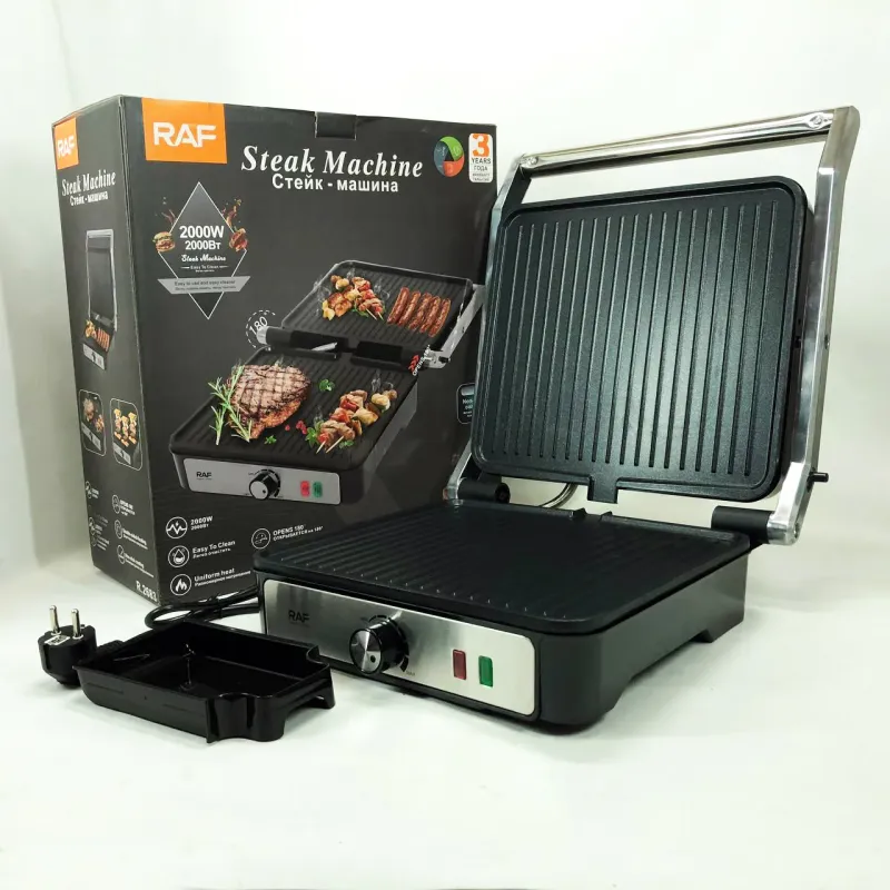 Контактный гриль прижимной электрический с терморегулятором и антипригарным покрытием RAF R-2683  - Хотите в любое время насладиться сочным стейком, хрустящими овощами или панини? Вам больше не нужно иметь кухню, полную бытовой техники. Все, что вам нужно, - это электрический гриль RAF.