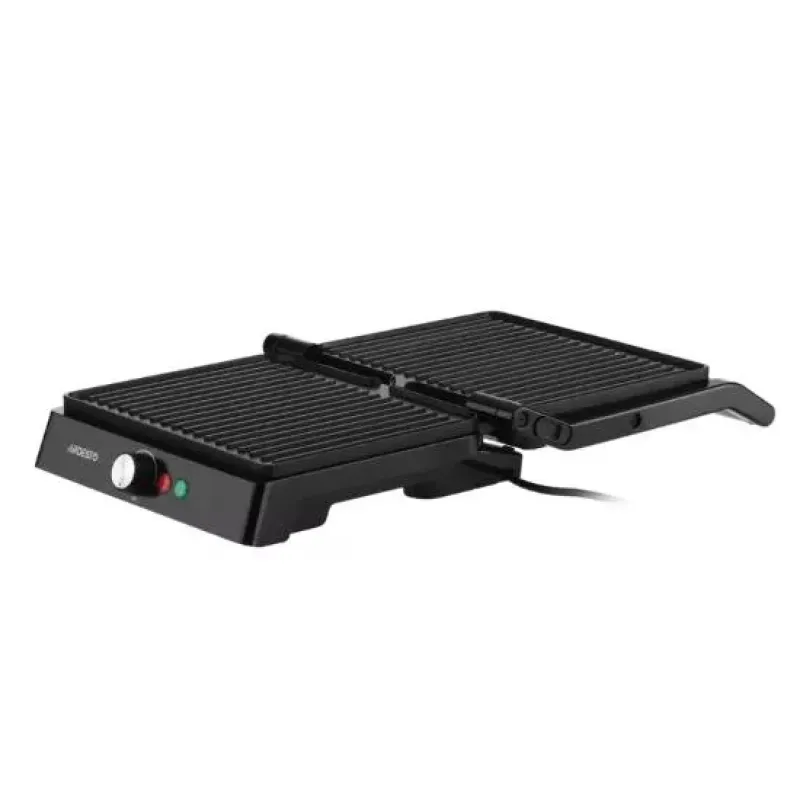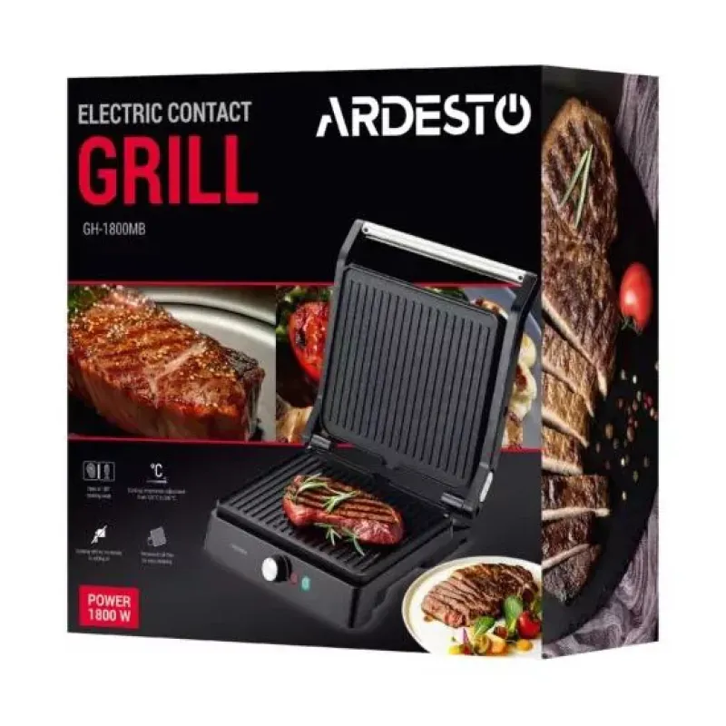 Электрогриль ARDESTO GH-1800MB Прижимной гриль ARDESTO GH-1800MB мощностью 1800 Вт и интуитивно понятным механическим управлением. Предусмотрено раскрытие на 180° и регулировку температуры. Устройство оснащено рифлеными керамическими противопригарными пла