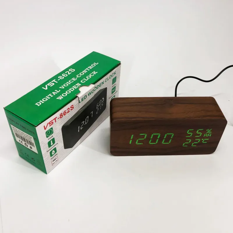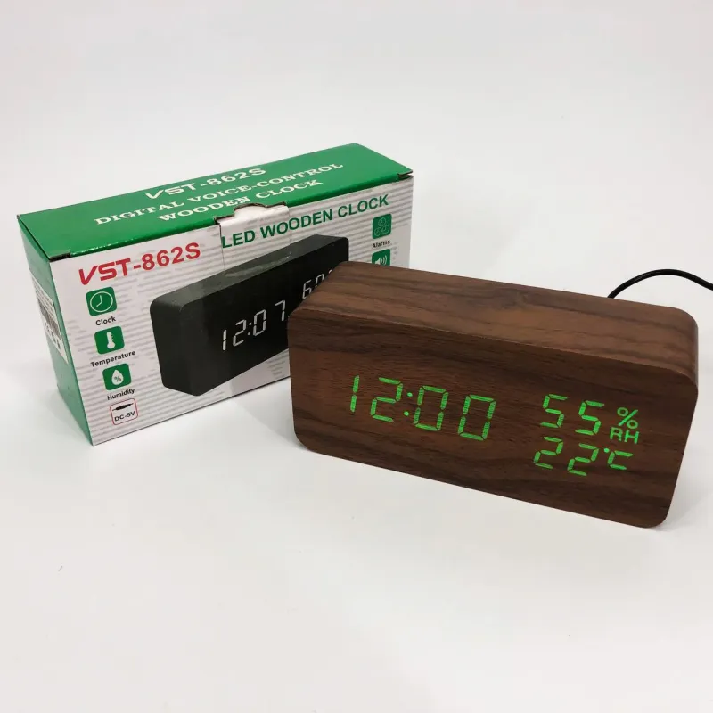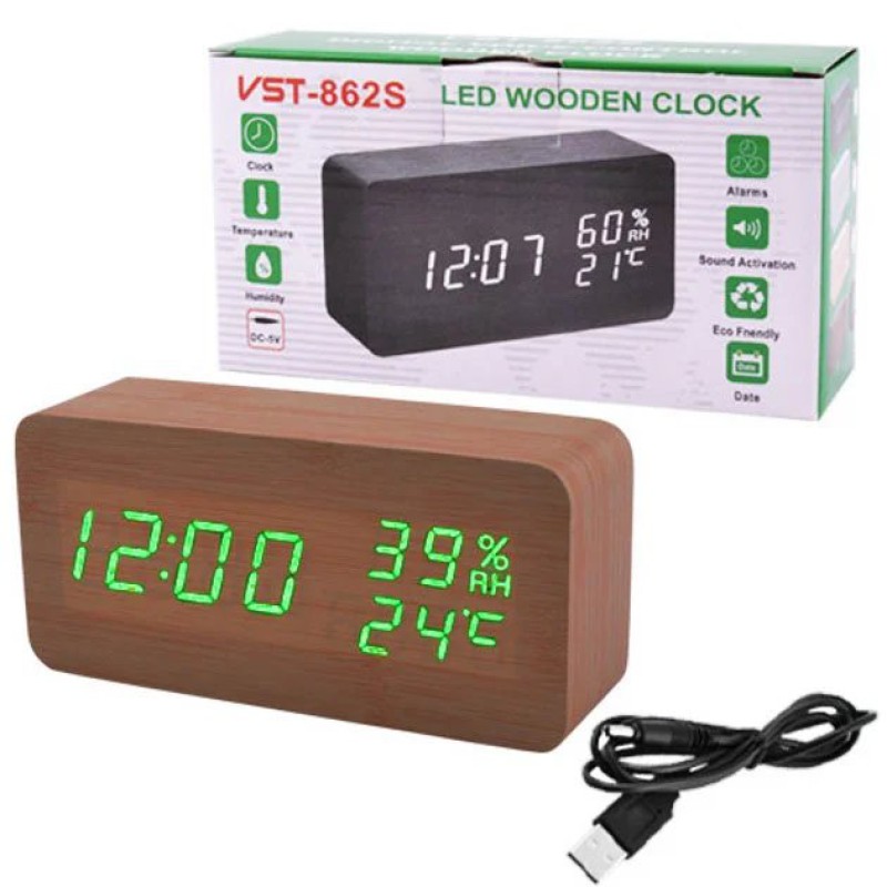 Электронные настольные часы VST-862S-4 коричневые с зеленой подсветкой, с датчиками температуры влажности