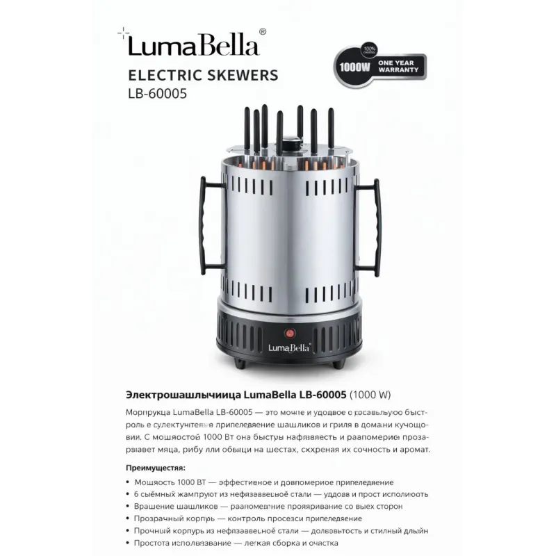 Электрошашлычница LumaBella LB-60005 (1000 W) Электрошашлычница LumaBella LB-60005 — удобное и компактное решение для приготовления сочного шашлыка в домашних условиях круглый год. Устройство равномерно прожаривает мясо со всех сторон, сохраняя вкус и соч