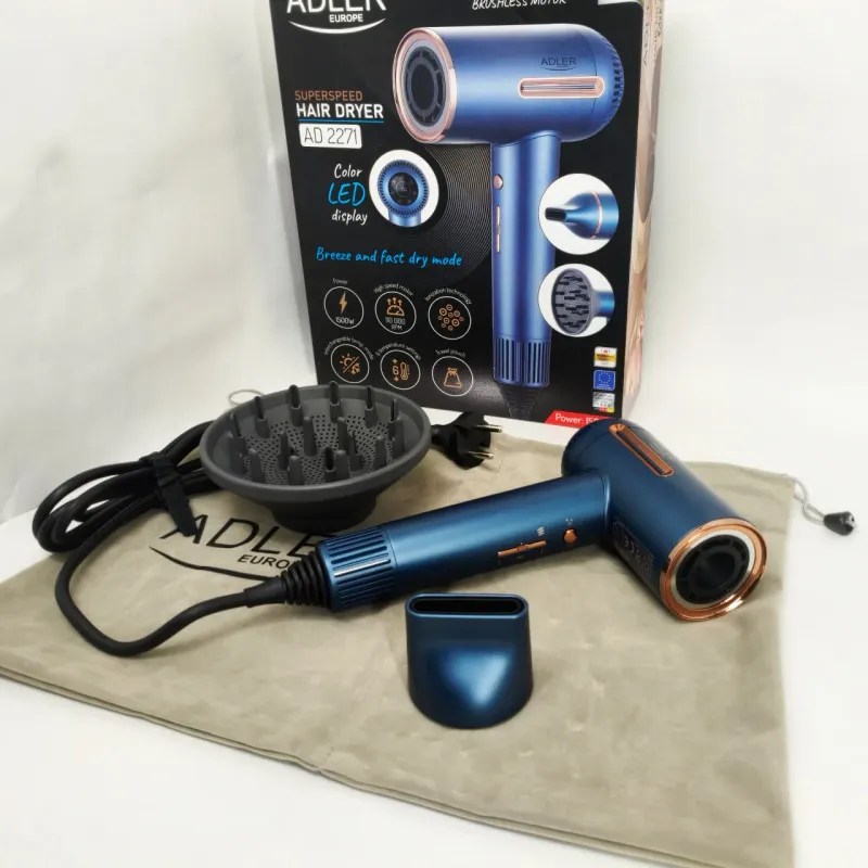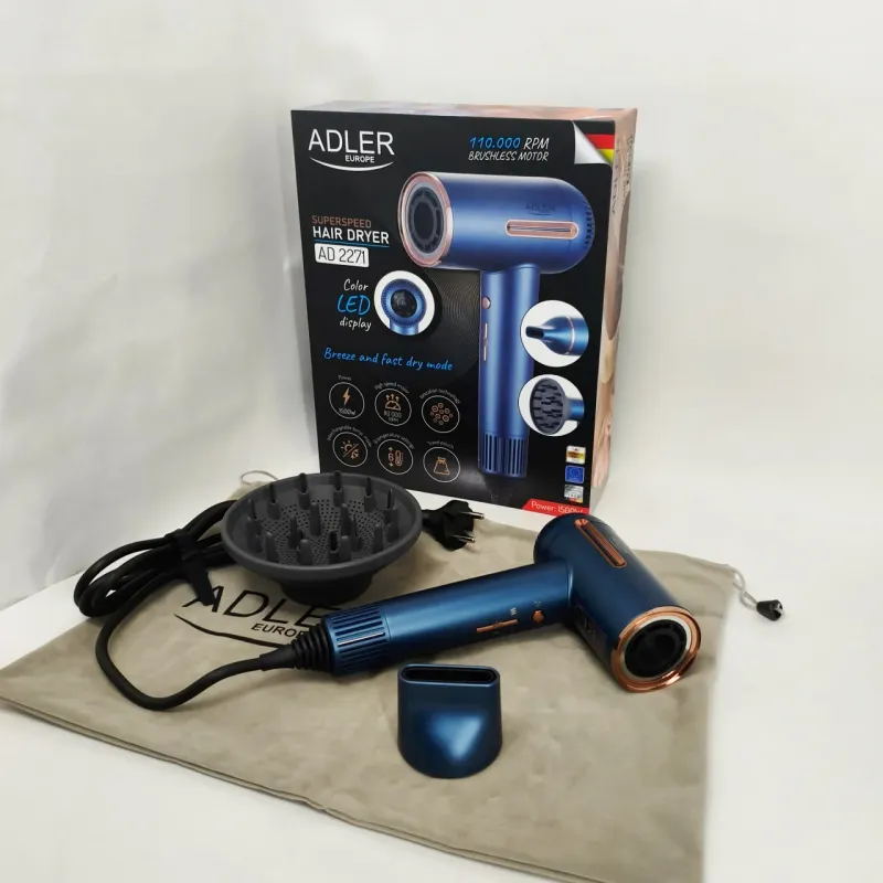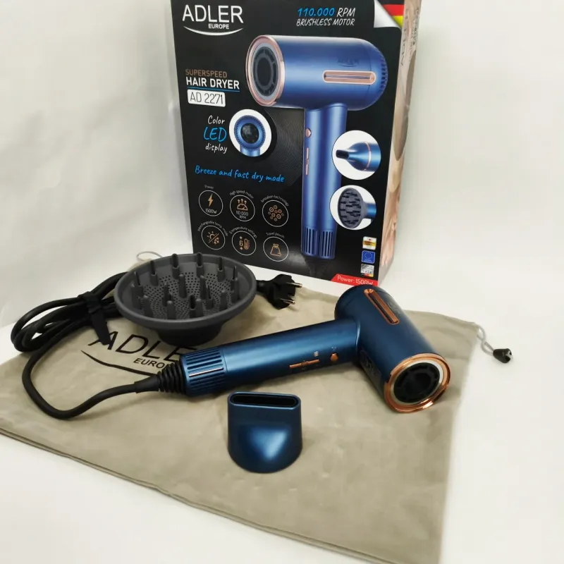 Фен имеет 3 уровня мощности обдува и 6 температурных режимов, что позволяет вам настроить его в соответствии с вашими индивидуальными потребностями. Кроме того, три режима работы (переменная температура, бриз, быстрая сушка) обеспечивают универсальное использование устройства. Фен Adler AD 2271 выделяется на рынке благодаря исключительно высокой скорости воздушного потока — до 18 м/с.