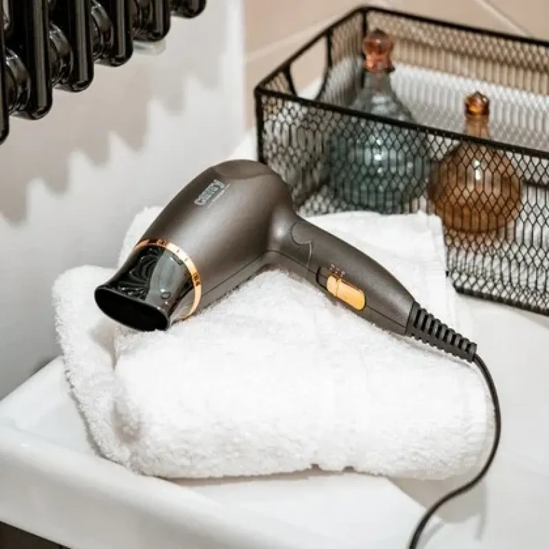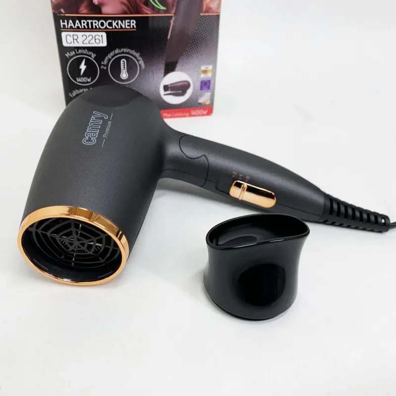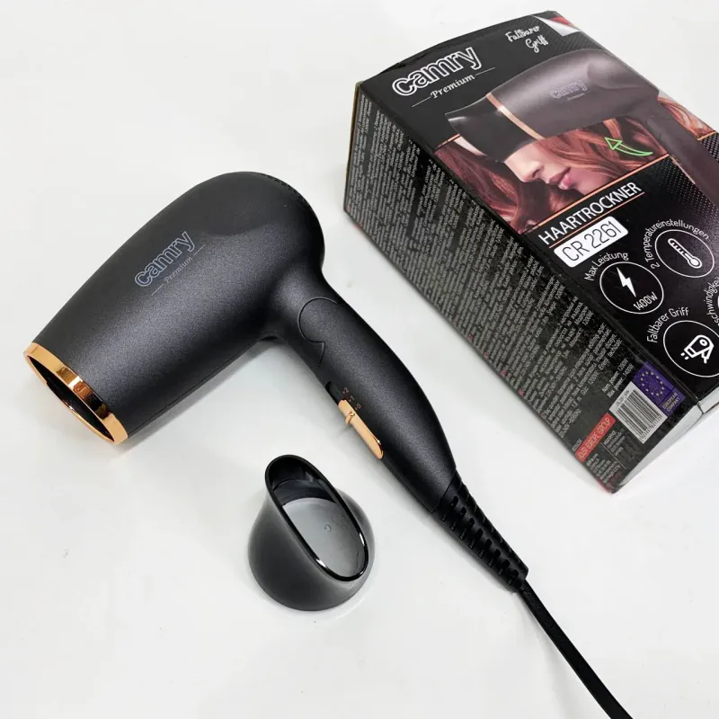 Camry CR-2261 стане незамінним помічником як у домашньому побуті, так і в подорожах завдяки своїй складній ручці. Ідеальний для тих, хто цінує швидкість сушіння волосся і водночас прагне зберегти їхню здорову структуру. Фен підходить для сухого і вологого волосся різної довжини — від коротких стрижок до довгих локонів. Концентратор допомагає легко створювати зачіски з об’ємом, прямі пасма або виразні локони, що дозволяє економити час, відмовляючись від зайвих інструментів укладання. Завдяки двом рівням температури пристрій підлаштовується під індивідуальні потреби ваших волосся, забезпечуючи безпечний і професійний догляд.