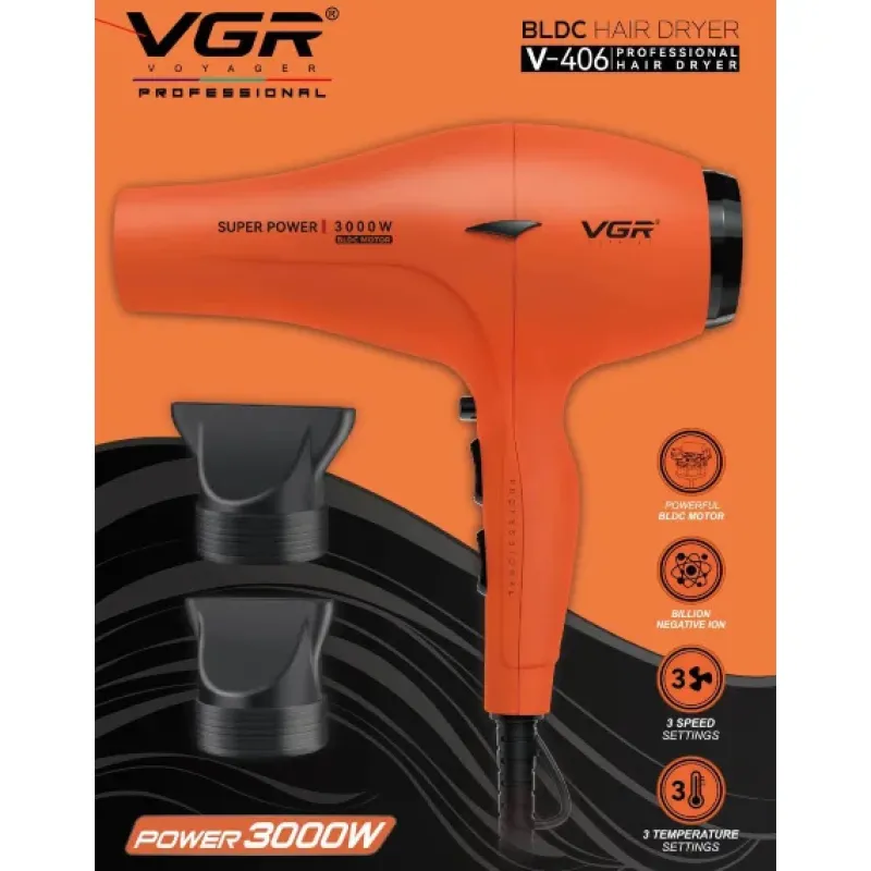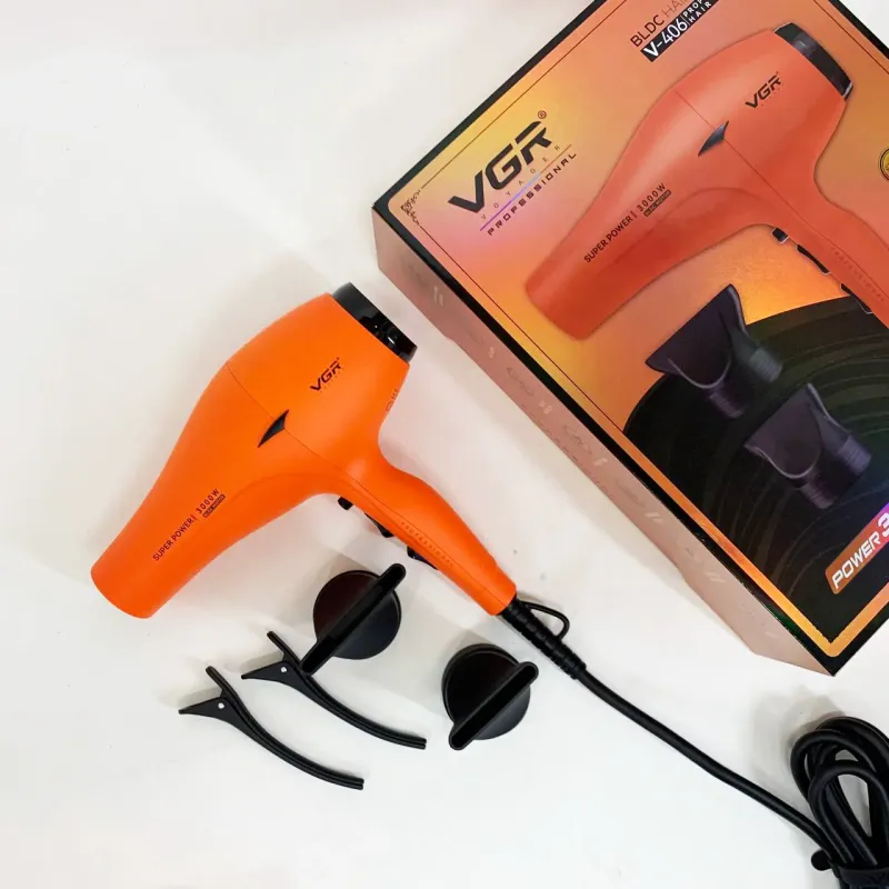 Фен поддерживает 3 уровня скорости обдува и 3 режима температуры, что позволяет подобрать оптимальные параметры для любого типа волос — от тонких до густых. В комплект входят 2 насадки: концентратор для точной укладки и насадка для быстрой сушки. Благодаря сочетанию мощности, функциональности и удобства, VGR V-406 ORANGE станет отличным выбором как для мастеров, так и для домашнего использования.