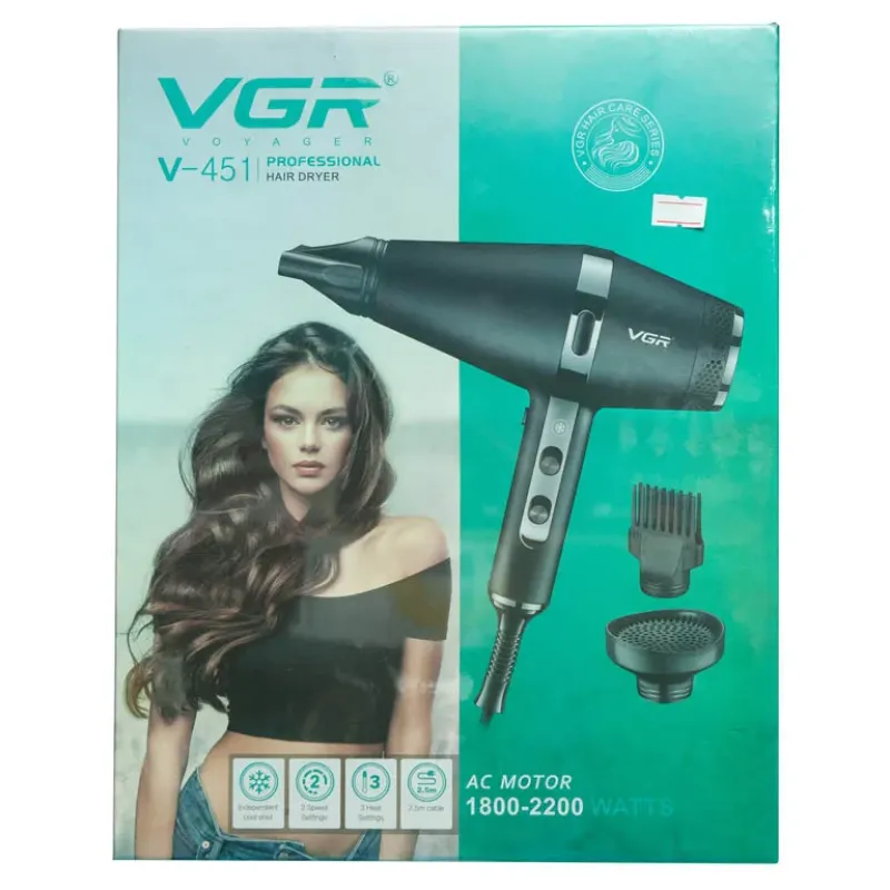 Фен VGR V-451 має номінальний вольтаж AC220-240V змінного струму, що дає змогу використовувати його в більшості країн. Потужність фена становить 2200W, що забезпечує швидкий і потужний потік повітря для швидкого сушіння волосся.