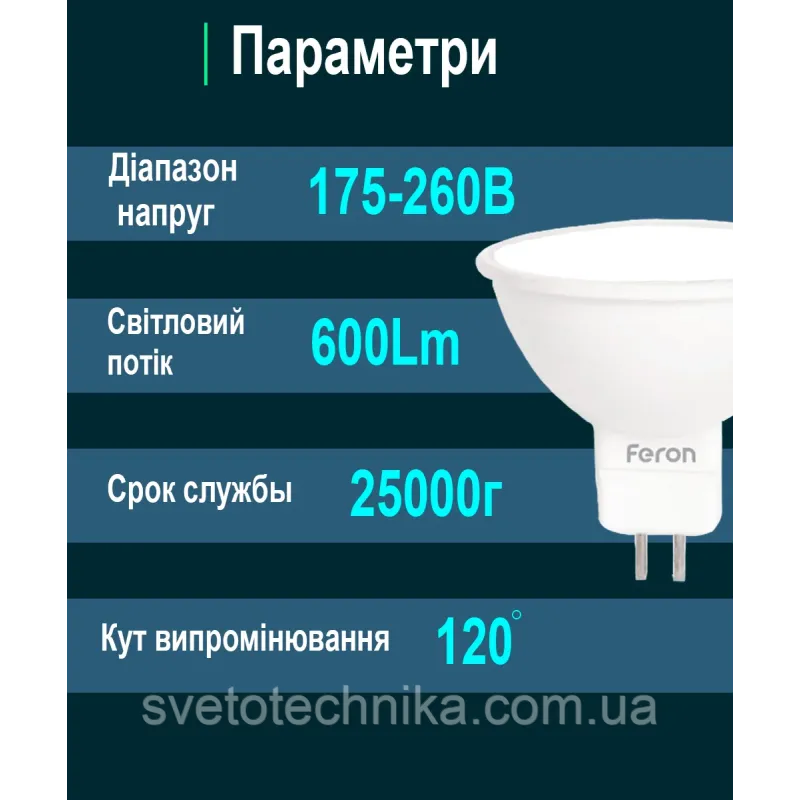 Теги: світлодіодна лампа MR16, Feron LB196, лампа G5.3, тепле світло 2700K, енергозберігаюча лампа, точкове освітлення, LED лампа 7W