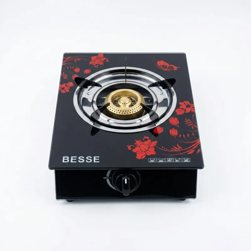 Оновіть свою кухню на дачі, у гуртожитку чи в літньому будиночку за допомогою стильної та сучасної настільної газової плити BESSE. Ця модель вигідно відрізняється від звичайних металевих плит своїм преміальним дизайном: робоча поверхня виготовлена з міцного жаростійкого скла чорного кольору, прикрашеного елегантним візерунком (квіти та метелики). Крім естетичного вигляду, скляна поверхня неймовірно практична — вона легко миється від жиру та залишків їжі, зберігаючи свій блиск роками. Плита оснащена однією потужною конфоркою з латунною кришкою ("золотий" пальник), яка забезпечує рівномірне та ефективне горіння полум'я. Спеціальна конструкція пальника дозволяє економно витрачати газ. Для вашої зручності плита обладнана системою п'єзопідпалу, вбудованою в ручку керування — вам більше не потрібні сірники чи запальнички. Просто поверніть ручку, і вогонь запалає миттєво. Надійна підставка для посуду дозволяє використовувати як маленькі каструлі, так і великі сковорідки. Характеристики: Тип: Газова настільна плита (Таганок) Кількість конфорок: 1 Матеріал поверхні: Жаростійке загартоване скло (товщина ~7 мм) Тип пальника: Латунь (покращений розподіл вогню) Тип розпалювання: П'єзопідпал (автоматичний) Призначення: Під скраплений газ (балон) Колір: Чорний з червоним малюнком Виробник: BESSE