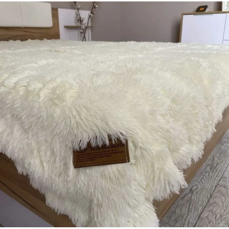 Теги: хутряний плед, плед-покривало, травичка євро, молочний колір, хутро, покривало, домашній текстиль