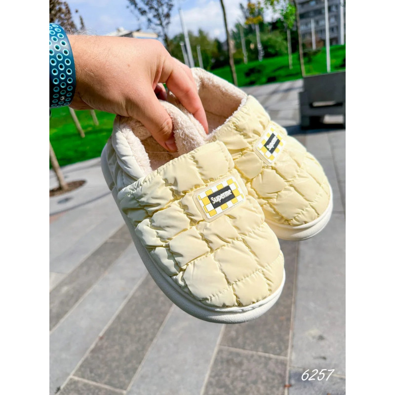 Завдяки дутій конструкції та м'якому утеплювачу, ці капці надійно зберігають тепло навіть у найхолодніші дні. Легка підошва забезпечує комфорт при ходьбі, а стильне поєднання кольорів капучино та світло жовтого додає настрою та свіжості вашому домашньому образу.