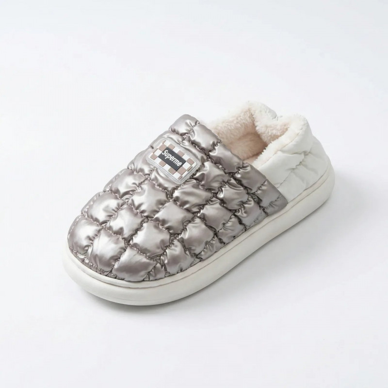 Зустрічайте хіт цього сезону — стильні та неймовірно теплі капці-дутіки Superme! Ця модель поєднує в собі комфорт домашнього взуття та практичність вуличних снігоходів. Верх виготовлений з міцної стьобаної плащової тканини з ефектним сріблястим відливом, яка легко чиститься і захищає від вологи. Всередині капці повністю утеплені густим та м'яким штучним хутром білого кольору, що гарантує тепло навіть на холодній плитці. Масивна, але легка підошва з піни ЕВА (EVA) забезпечує чудову амортизацію та не пропускає холод від підлоги. Завдяки закритій пятці та універсальному дизайну, вони ідеально підходять для всієї родини (розміри від 36 до 45). Характеристики: Матеріал верху: Плащівка (вологостійка, стьобана) Матеріал підкладки: Штучне хутро (густе) Підошва: Піна ЕВА (EVA) — легка та тепла Колір: Сріблястий (Сірий металік) Декор: Нашівка "Superme" Сезон: Зима / Осінь Стать: Унісекс Розмірна сітка: 36-45