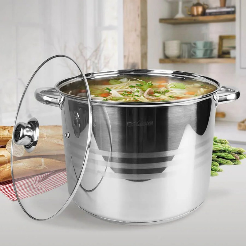 Кастрюля с крышкой MR-3517-16 — для приготування супів, каш, тушкованих страв та варіння на весь сімейний стіл. Размеры: 30×23 см. Объём: 16 л. Толщина стенок 0,6 мм Возможно использование на всех типах плит Якісна нержавіюча сталь або антипригарне покриття забезпечують гігієнічність та довговічність. Скляна кришка дозволяє стежити за процесом приготування без відкривання. Зручні ручки-прихватки не нагріваються. Підходить для всіх видів плит включно з індукційними.