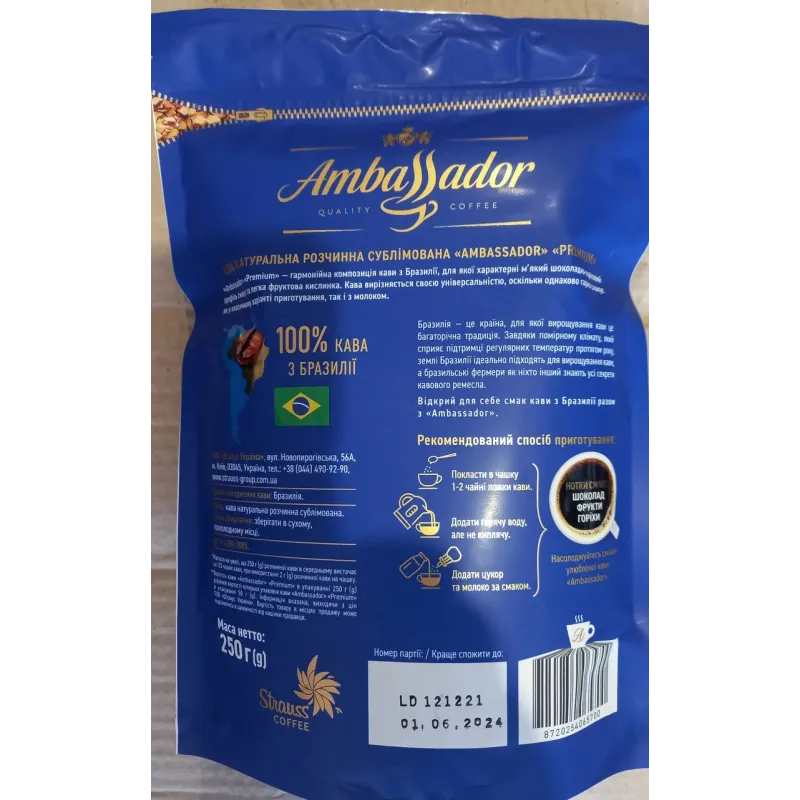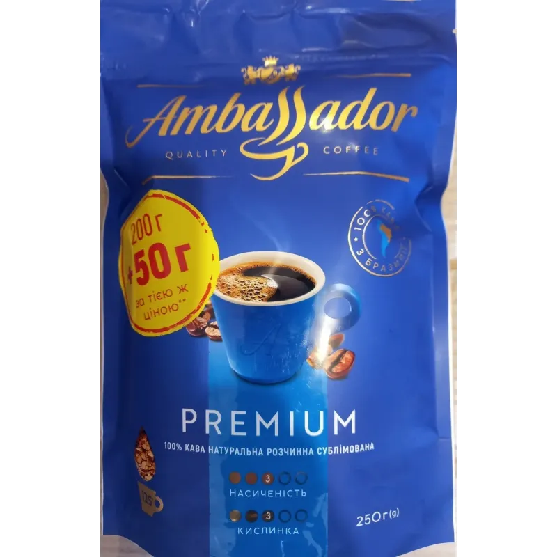Теги: кава розчинна, Ambassador Premium, сублімована кава, кава Амбассадор, розчинна кава 250г, преміум кава, кава в м'якій упаковці