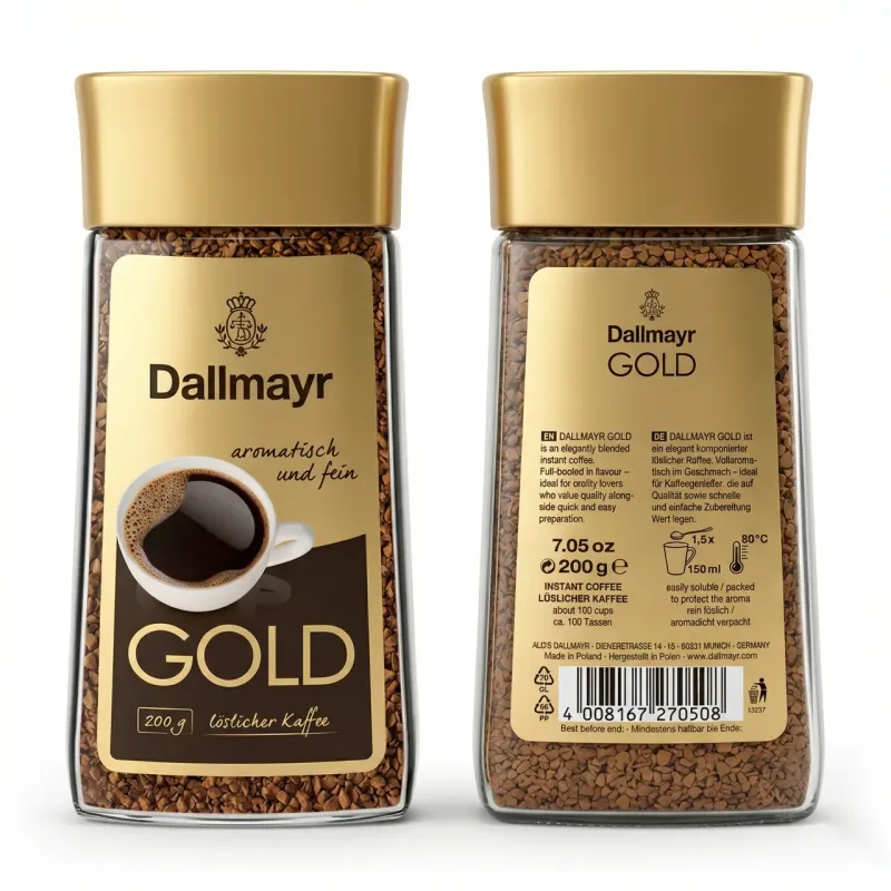 Dallmayr Gold — це елегантна композиція розчинної кави для справжніх цінителів якості, які економлять свій час. Виготовлена відомим німецьким кавовим домом Alois Dallmayr (Мюнхен), ця кава поєднує в собі насичений смак та витончений аромат свіжозмелених зерен. Завдяки технології сублімації (freeze-dried), гранули зберігають усі властивості натуральної кави. Напій виходить "повнотілим" (full-bodied), з приємною пінкою та без зайвої гіркоти. Це ідеальний вибір для ранкового пробудження або кава-брейку в офісі, коли важлива швидкість та простота приготування. Однієї банки вагою 200 г вистачає приблизно на 100 чашок ароматного напою. Скляна тара з щільною кришкою надійно захищає каву від вологи та зберігає її "золотий" стандарт якості. Характеристики: Виробник: Alois Dallmayr (Німеччина). Країна виробництва: Польща (Made in Poland). Тип кави: Розчинна (сублімована) / Löslicher Kaffee. Вага: 200 г (7.05 oz). Упаковка: Скляна банка. Кількість порцій: ~100 чашок.