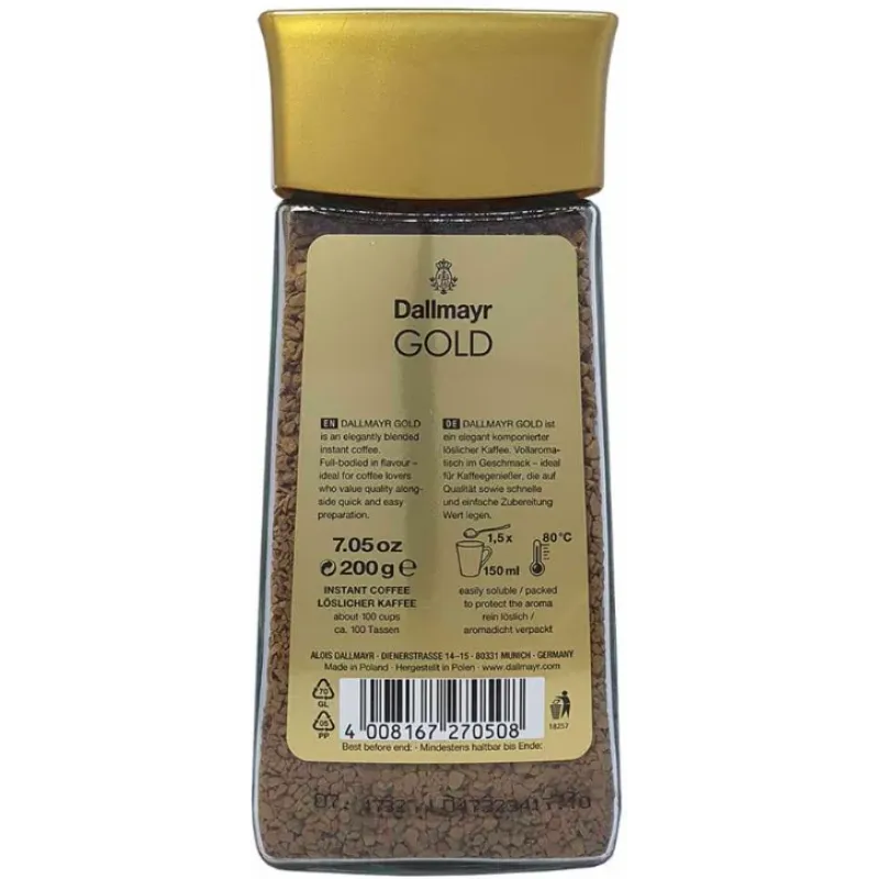 🛒 Шукаєте надійний товар? Ви можете купити Кава розчинна Dallmayr Gold 200 г (скло) | Німецька сублімована кава Даллмаєр Голд Оригінал в нашому інтернет-магазині Shtyrman. Гарантія якості та швидка доставка по всій Україні!
