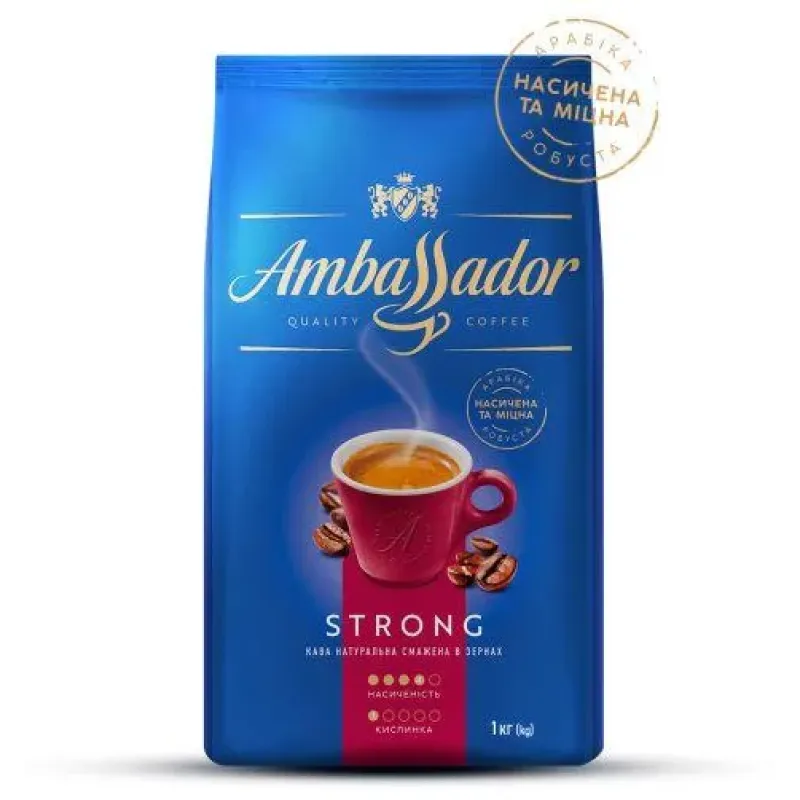 Теги: кава в зернах, міцна кава, Ambassador Strong, темне обсмажування, кава для еспресо, зернова кава 1 кг, насичений смак кави