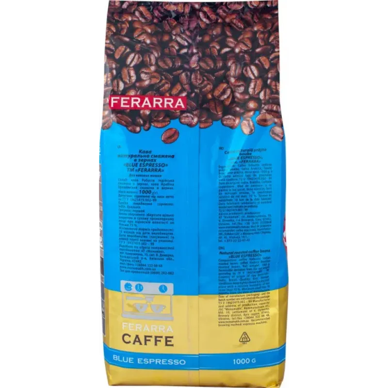 Теги: кава в зернах, Ferarra Blue Espresso, преміум кава, кава середнього обсмаження, кава для еспресо, купаж кави, кава 1 кг