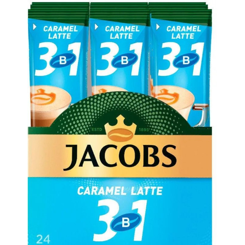 Кавовий напій Jacobs 3в1 Caramel Latte 24 стіки (упаковка) | Карамельний лате, Висока пінка, Десертна кава