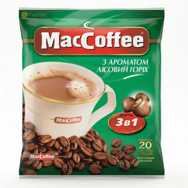 Теги: кава 3в1, MacCoffee, кавовий напій з горіхом, розчинна кава, кава в стіках, МакКофі Лісовий Горіх, кава для офісу