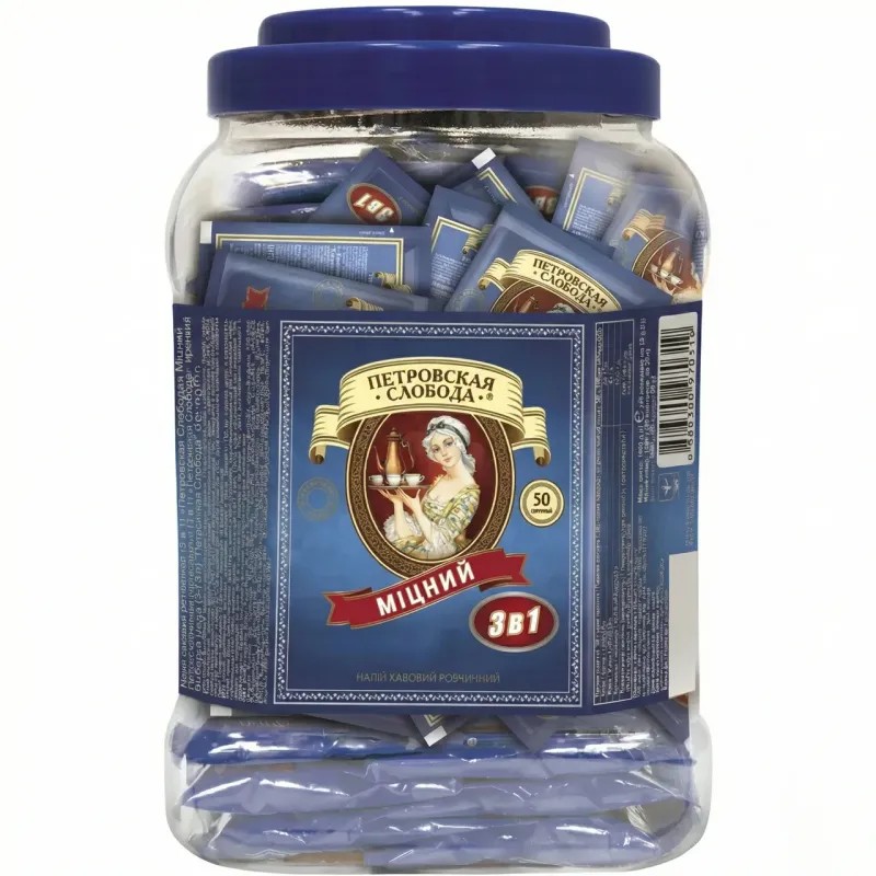 Кавовий напій Петрівська Слобода 3в1 Міцний — 50 пакетиків у зручній банці для офісу та опту