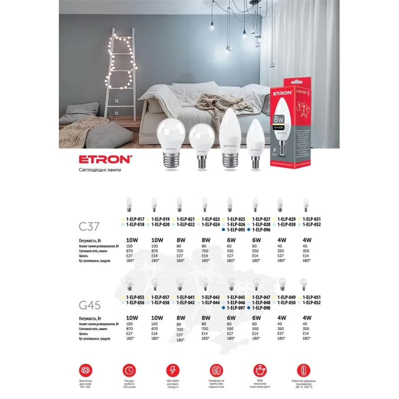 Теги: світлодіодні лампи, LED лампи E14, енергозберігаючі лампи, лампи тепле світло, ETRON лампи, освітлення для дому, економні лампи