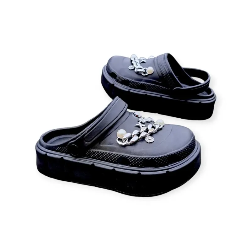 Легке та зручне взуття для активного літа, відпочинку та повсякденного носіння. Чорні крокси з декоративними стразами поєднують практичність класичної моделі з елегантним акцентом, який додає образу жіночності.