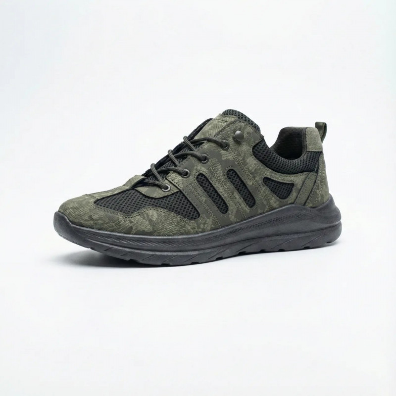 Виготовлені з високоякісних матеріалів, кросівки забезпечують максимальну вентиляцію завдяки спеціальній дихаючій сітці, що робить їх ідеальним вибором для спекотних літніх днів. Камуфляжний принт у відтінках хакі не тільки надає взуттю стильного мілітарі-вигляду, але й забезпечує практичність — на такому взутті менш помітні забруднення. Розмірний ряд від 41 до 45 розміру дозволяє підібрати ідеальну пару для більшості чоловіків.