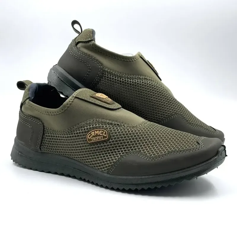 Сітчастий матеріал забезпечує постійну циркуляцію повітря, запобігаючи перегріву стоп. Легка конструкція знижує навантаження на ноги, а гнучка підошва адаптується до рухів. Нейтральний колір хакі дозволяє носити їх з джинсами, шортами та спортивним одягом.