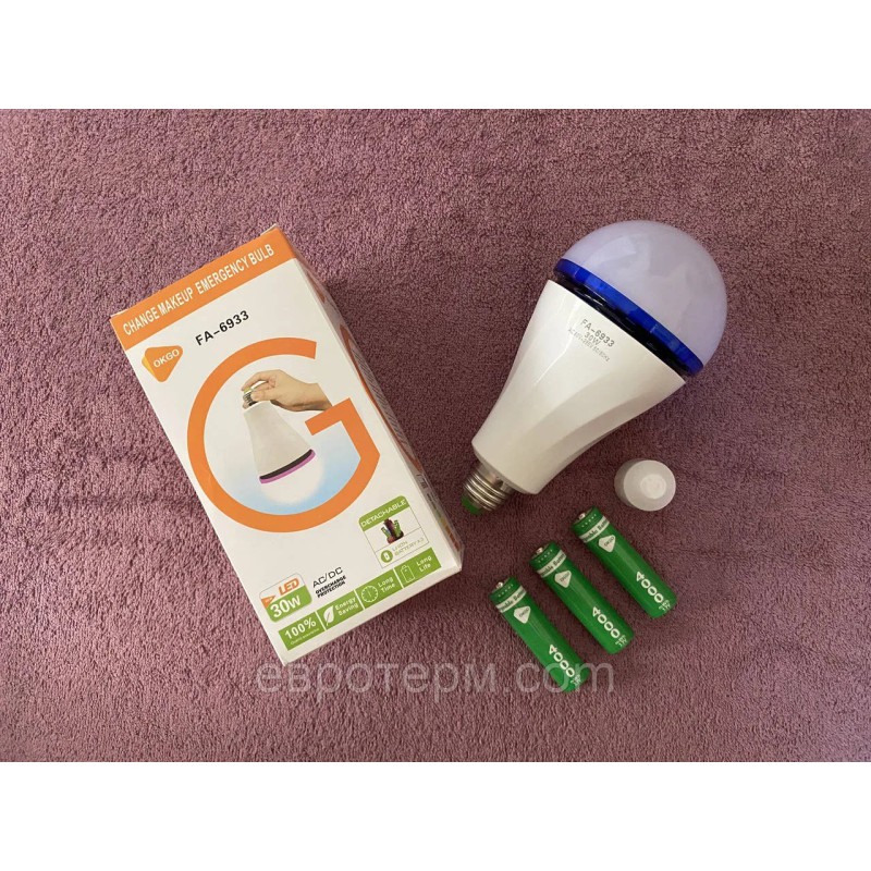 Лампа OKGO FA-6933 з вбудованим акумулятором 3x18650 забезпечує яскраве освітлення потужністю 30W навіть під час відключення електроенергії. Стандартний цоколь Е27 дозволяє використовувати її в будь-якому світильнику.
