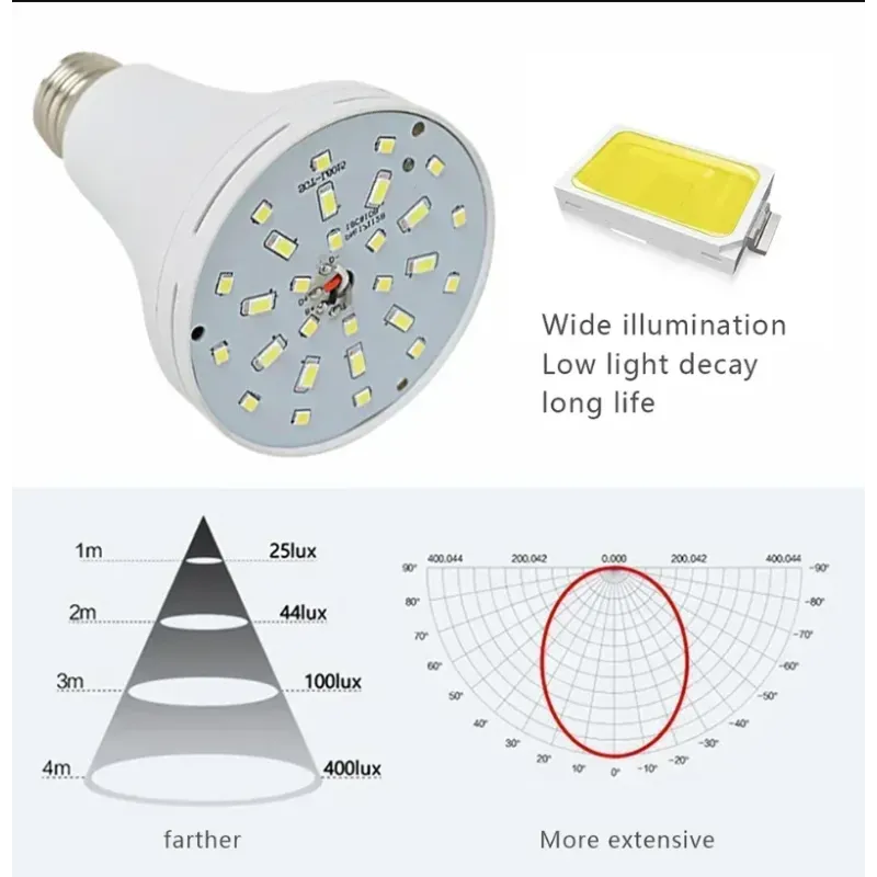 Лампа працює як звичайна при наявності електрики та автоматично перемикається на акумулятор при відключенні. Просто вкрутіть її в патрон — і забудьте про темряву. Потужність 7 Вт забезпечує яскраве освітлення кімнати площею до 15 м².