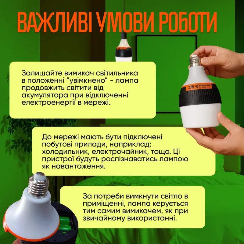 Вкрутіть лампу в стандартний патрон Е27 та ввімкніть світло — акумулятор почне заряджатися автоматично. При відключенні електрики лампа продовжить світити від вбудованого акумулятора. Також можна використовувати як переносне джерело світла.