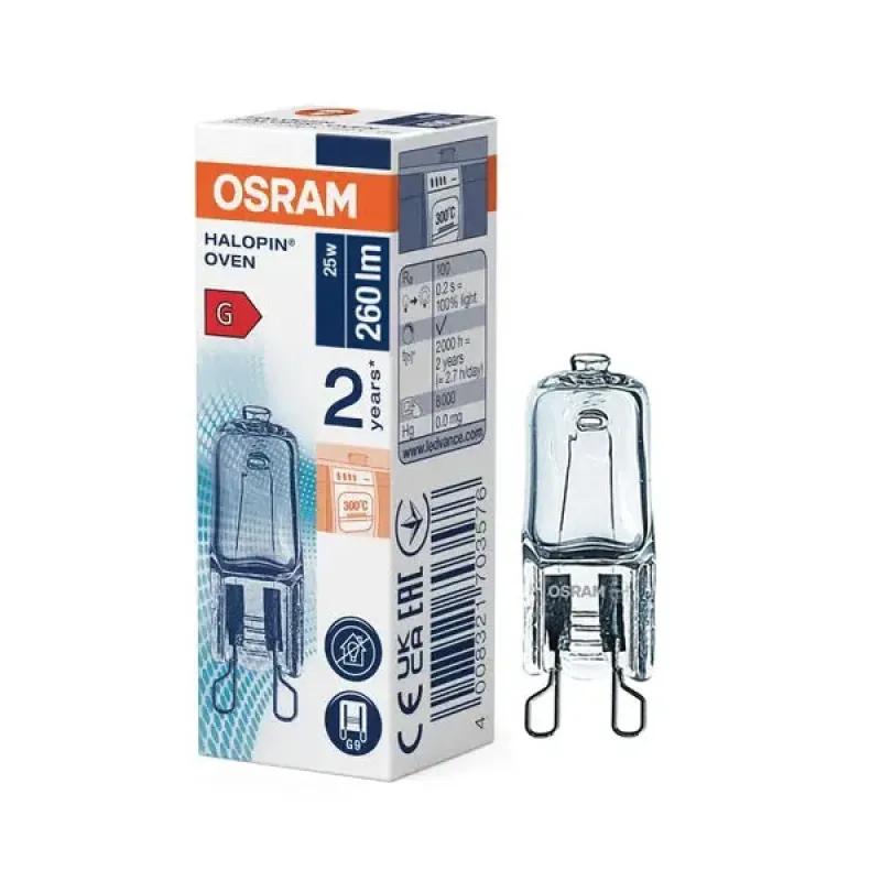 Теги: лампа для духовки, Osram 66725, галогенна лампа G9, термостійка лампа, освітлення духовки, лампа 300 градусів, запчастини для духовок