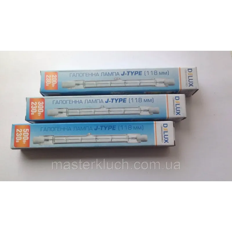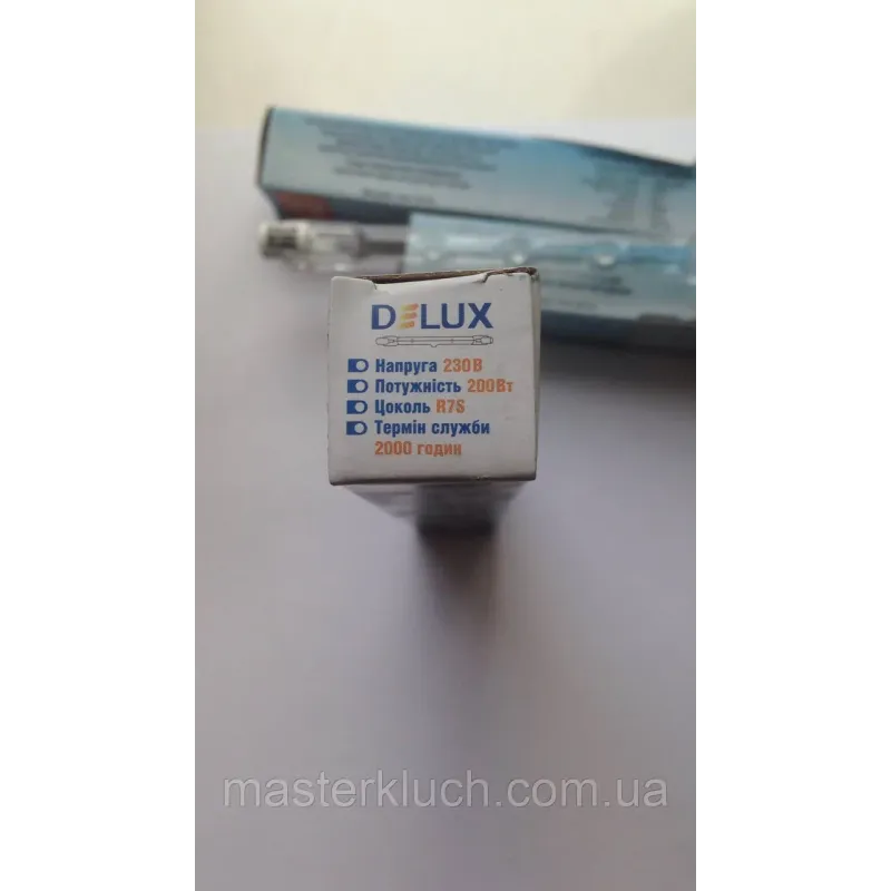Теги: галогенна лампа R7S, лампа 200Вт 118мм, лампа для прожектора, R7S Delux, лінійна галогенна лампа, освітлення 200Вт, купити галогенну лампу