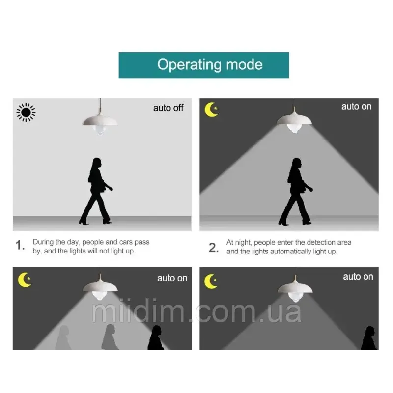 - **Автоматичне вмикання** — сенсор реагує на рух у радіусі 3-5 метрів, кут охоплення 120°